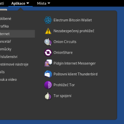 V horní liště najdete v: Aplikace/Internet také aplikaci Nezabezpečený prohlížeč. Ten slouží právě třeba pro prohlížení webových stránek, na kterých je přístup s IP adresou z Toru zablokován. Nutno říci, že skrze tuto aplikaci nebude vaše IP adresa skryta a na nezabezpečené síti může být sledována i vaše aktivita poskytovatelem internetu. To však můžete zabezpečit nějakou VPN službou, kterou si můžete nastavit v nastavení systému. Mezi aplikacemi najdeme i další aplikace starající se o anonymitu skrze Tor, aplikaci OnionShare pro bezpečné a anonymní sdílení souborů, krypto peněženku Electrum Bitcoin Wallet, výborného e-mailového klienta Mozilla Thunderbird a komunikační legendární aplikaci Pidgin.V dalších položkách menu aplikací nechybí ani třeba kancelářský open-source balík LibreOffice, KeePassXC, Kleopatra, Textový editor, Vim a další.