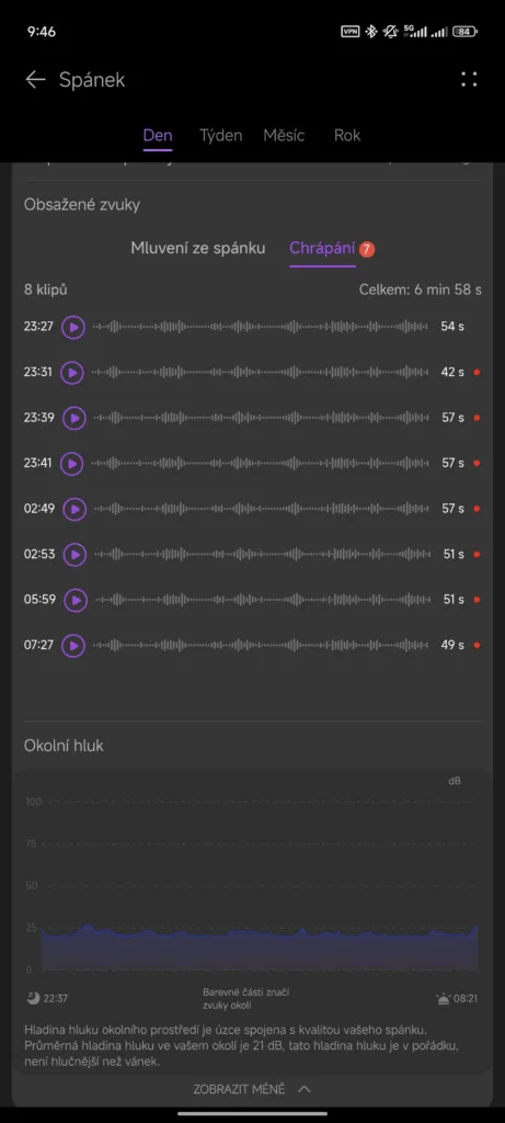 Mobilní aplikace Huawei Zdraví je dostupná pro jakýkoliv mobil s Androidem, EMUI a dokonce i pro iOS. Funkci pro nahrávání chrápání zrovna nemohu vyzkoušet, ale i bez hodinek funkce na Android mobilech funguje bez problémů.