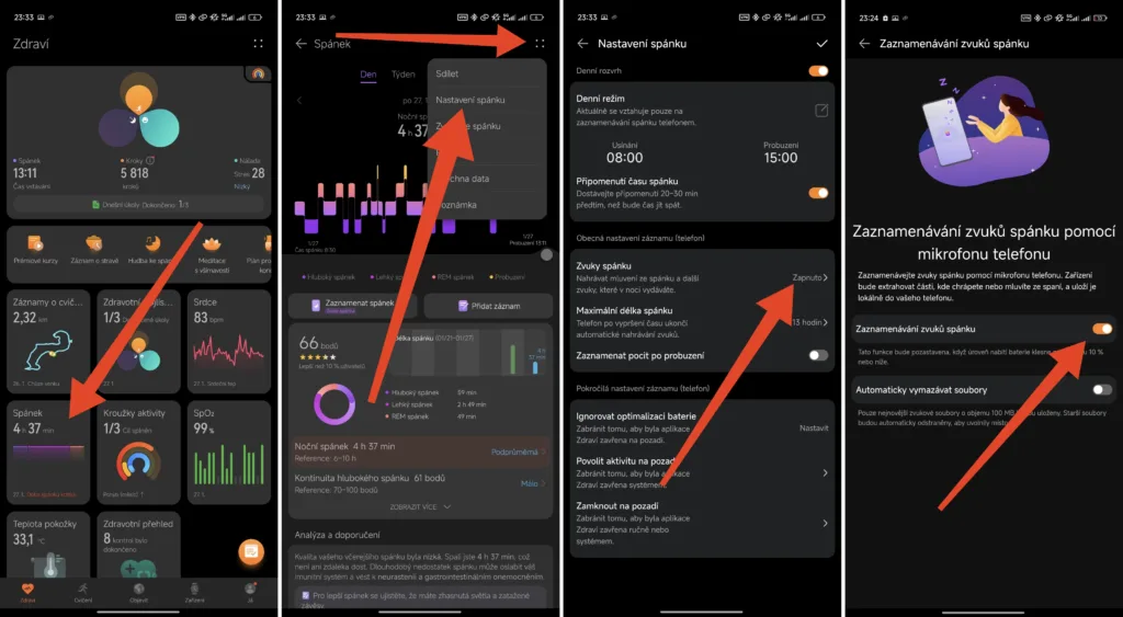 - Na hlavní obrazovce aplikace přejděte do „Spánek“, vpravo nahoře do možností a „Nastavení spánku“. Zde zkontrolujte, zda je povolena funkce „Zvuky spánku“. Pokud ne, povolte ji a tlačítkem nahoře nastavení uložte.