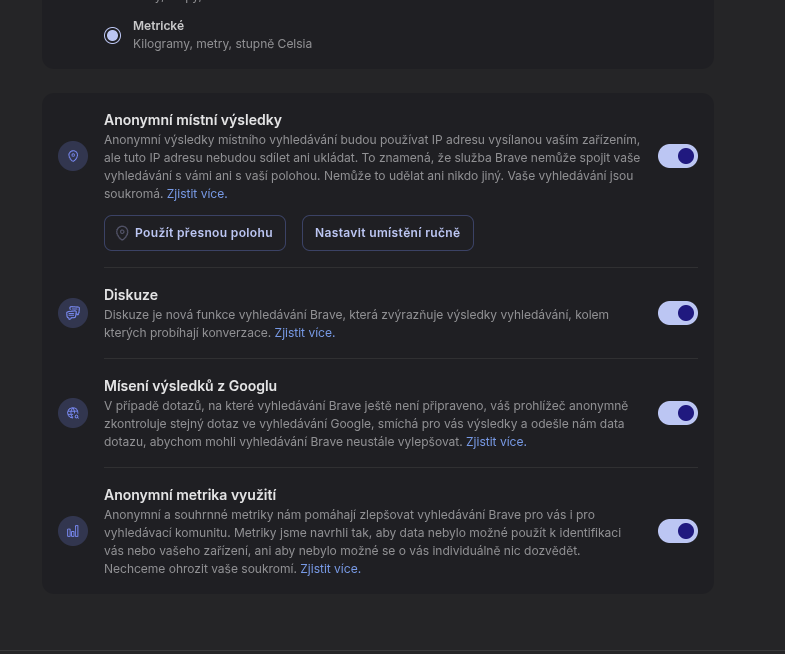 Co když mi výsledky z Brave nevyhovují? Doporučuji přejít na web vyhledávače a otevřít jeho nastavení. Zde můžete vypnout bezpečné vyhledávání, aby se zobrazoval i obsah pro dospělé, a zapnout funkci „Mísení výsledků z Googlu“. Budete tak dostávat výsledky z Brave Search i z Googlu přímo v Brave, přičemž vaše soukromí zůstane zachováno.
