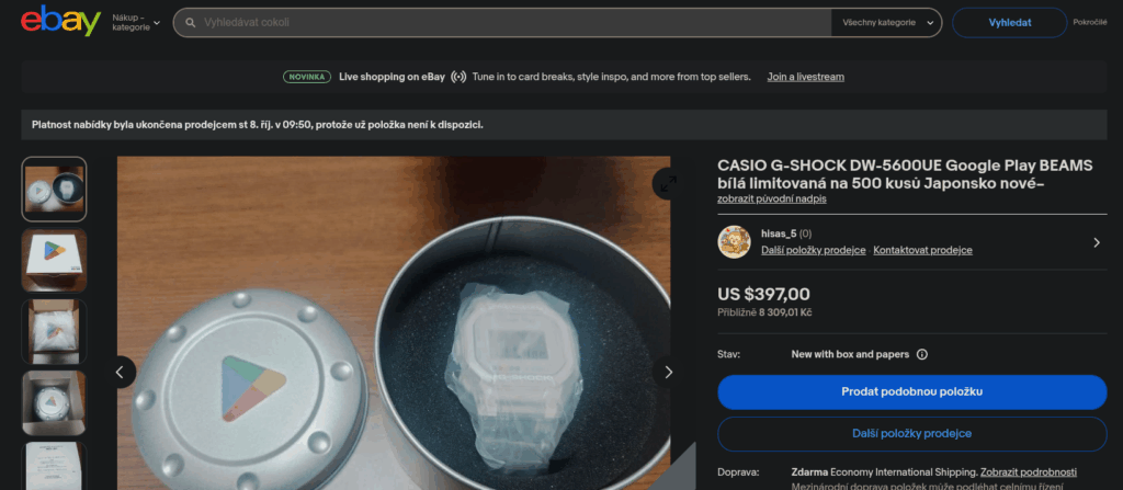 Jelikož se jedná o limitovaný model, jeho cena časem poroste. Již nyní se na eBay objevuje za 397 USD (přibližně 8 309 Kč). To je poměrně dost, protože běžná verze modelu DW-5600UE se prodává kolem 100 USD.