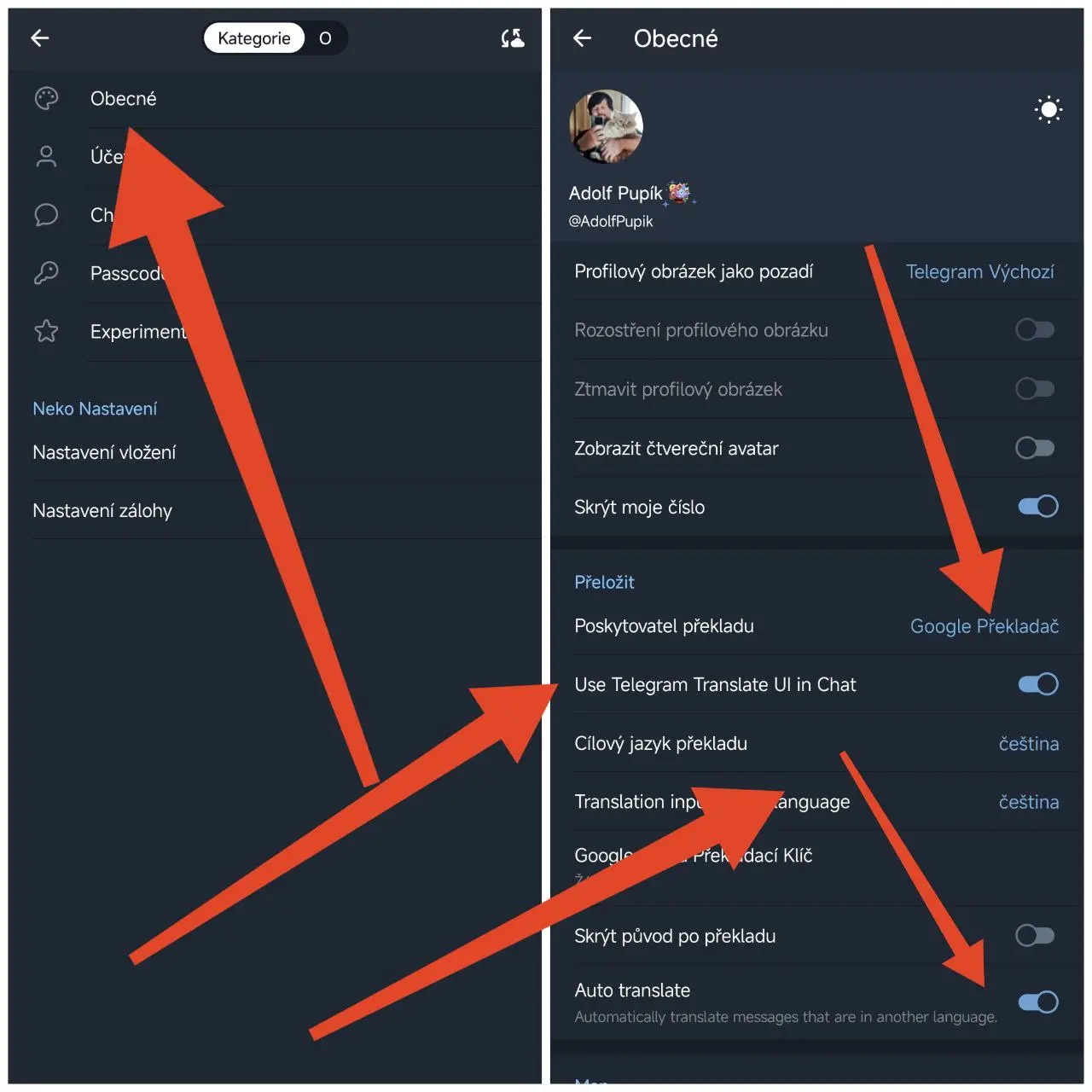 - Vyberte poskytovatele překladu „Google Překladač„, zapněte „Use Telegram Translate UI in Chat“, vyberte jazyk čeština a pokud vyžadujete automatické překlady, povolte ještě „Auto translate“.