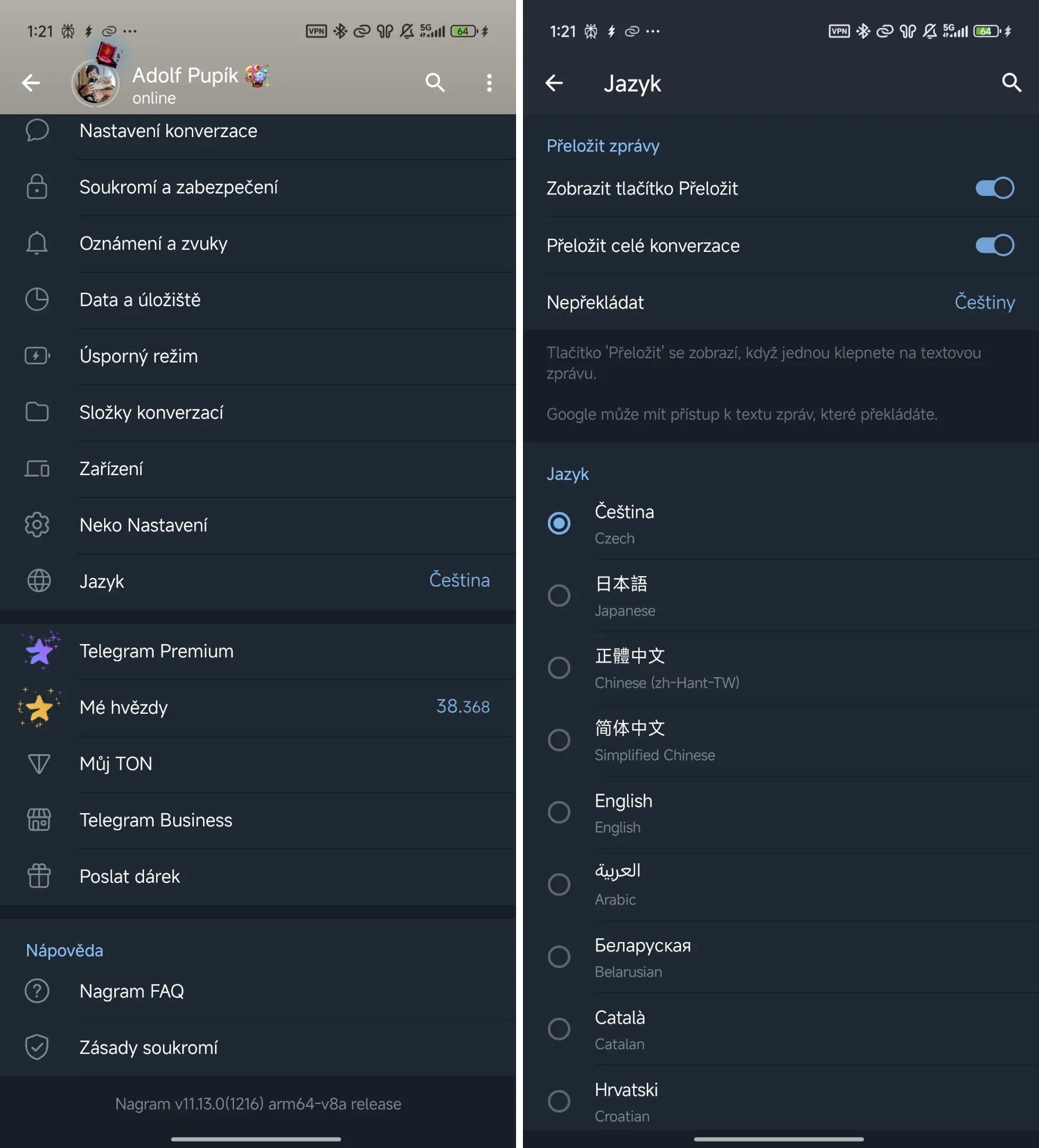 Nagram není žádným novým klientem, ale vychází z oficiální verze Telegramu. Najdeme v něm jen integrované bonusové funkce. Vás může potěšit lepší nastavení a výběr překladače. Je velká škoda, že již nefungují překlady skrze výborný DeepL, ale funkční jsou překlady skrze Google. Otestoval jsem manuální překlady z různých jazyků a jelikož mám Telegram Premium, funguje mi automatické překládání. Musíte však Nagram správně nastavit.