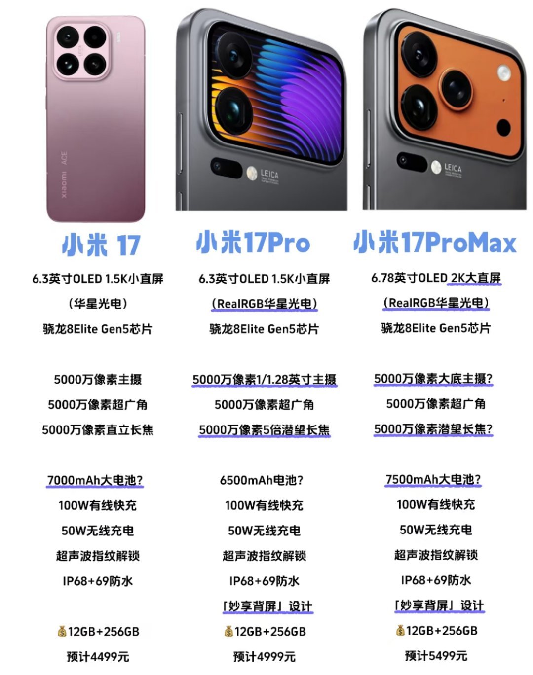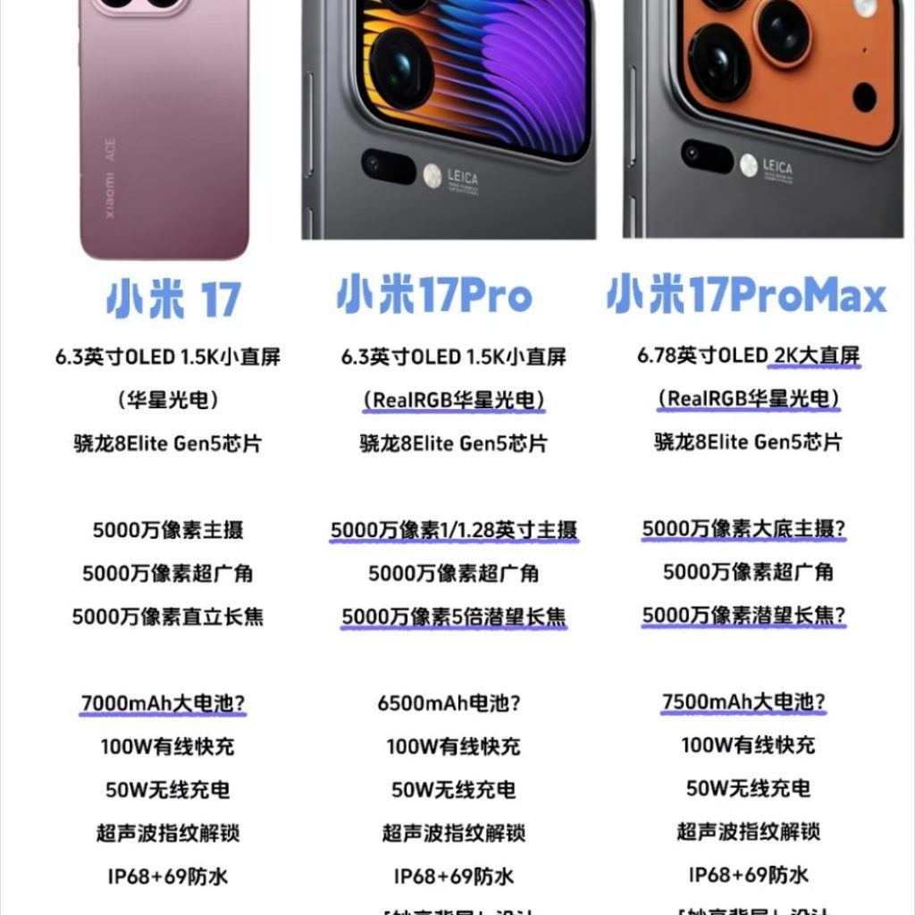Všechny modely mají nabídnout Android 16 s prostředím HyperOS 3, 100 W drátové a 50W bezdrátové nabíjení, zvýšenou odolnost IP68 a IP69 a také 12 GB RAM. Nasazen by měl být nový vlajkový procesor Qualcomm Snapdragon 8 Elite Gen 5 a ve všech případech půjde o LTPO OLED displeje. Velikosti úhlopříček se budou lišit – Xiaomi 17 a Xiaomi 17 Pro mají údajně dostat 6,3palcový displej, zatímco Xiaomi 17 Pro Max 6,78palcový panel. O modelu Xiaomi 17 Ultra zatím mnoho informací není, ale na uniklé fotografii se již objevil jeho akumulátor.