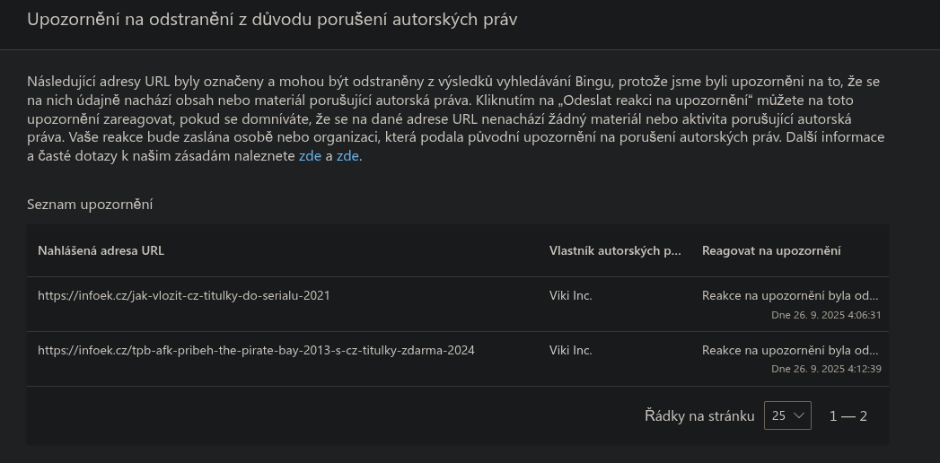 Níže můžete vidět screenshot s odkazy na tento web. První odkaz pouze vysvětluje, jak do filmu přidat titulky ve formátu .srt. Je na tom něco, co by porušovalo autorská práva? Rozhodně ne. Druhý článek obsahuje dokument o legendární službě The Pirate Bay, který byl však publikován pod licencí Creative Commons (BY-NC-ND). Jedná se tedy o volně šiřitelné dílo. Bing tedy oba odkazy z vyhledávání odstranil neoprávněně a podle mého názoru tím porušuje svobodu slova.