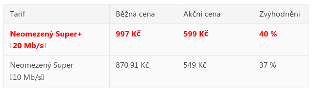 Pro mnohé bude zcela dostačující rovněž tarif Neomezený Super s rychlostí 10 Mb/s, u nějž je čeká zvýhodnění ve výši 37 %, a zájemce vyjde na 549 Kč měsíčně namísto standardních 870,91 Kč.