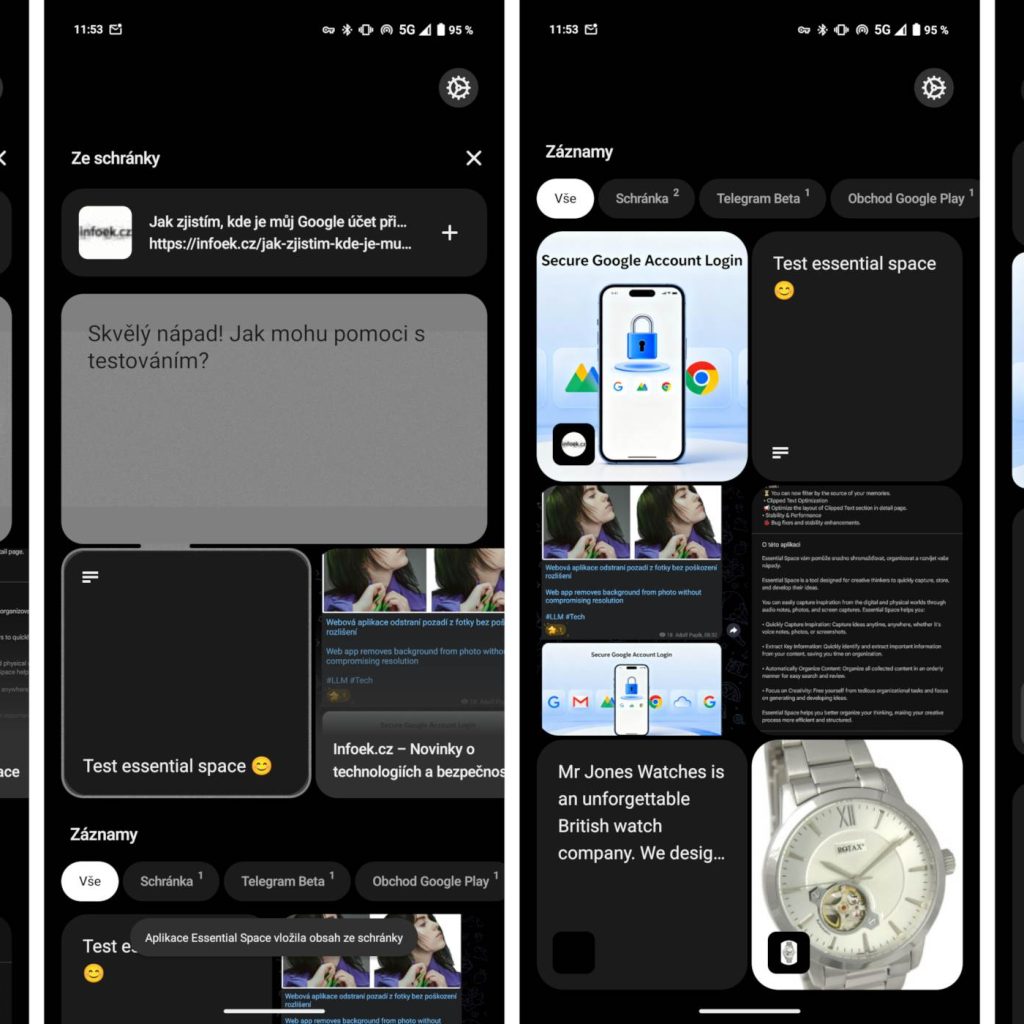 Osobně jsem zaznamenal spolehlivější stahování náhledových obrázků z článků po vložení odkazu a lepší vkládání jakéhokoli zkopírovaného textu či odkazů ze schránky. Konečně se v aplikaci objevilo také automatické třídění screenshotů s poznámkami – podle schránky nebo názvu aplikace, ze které byl snímek pořízen. Nothing dále uvádí, že aktualizace přináší opravy chyb a zlepšení stability.