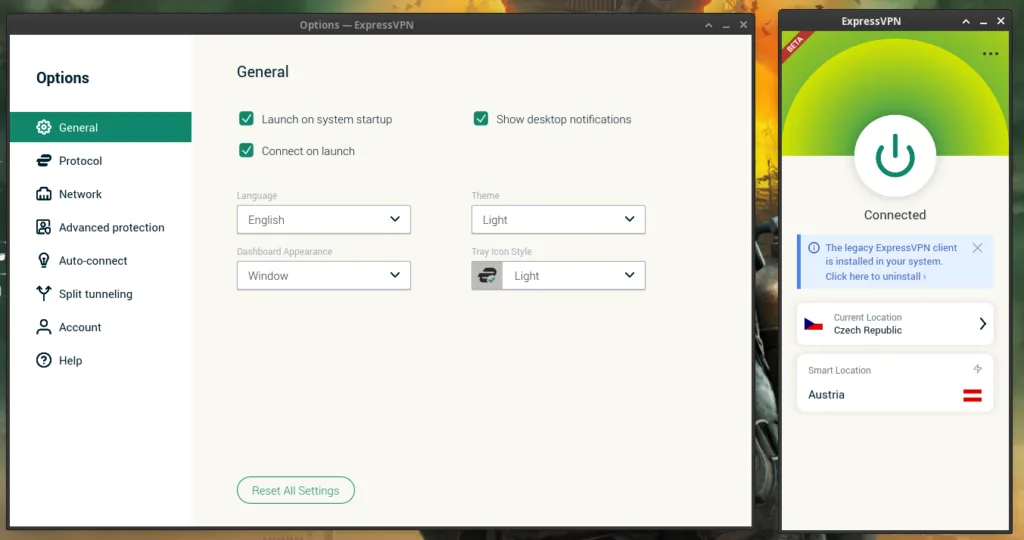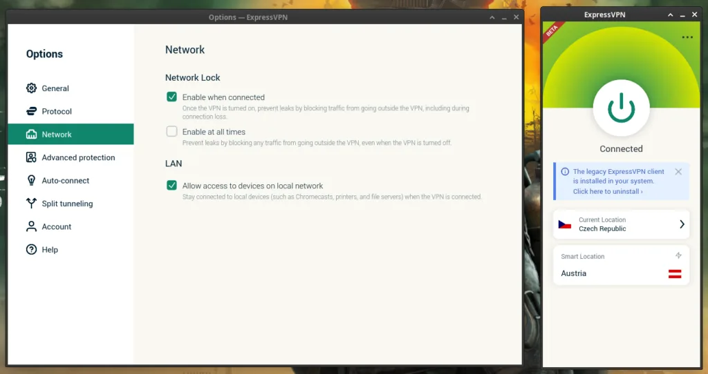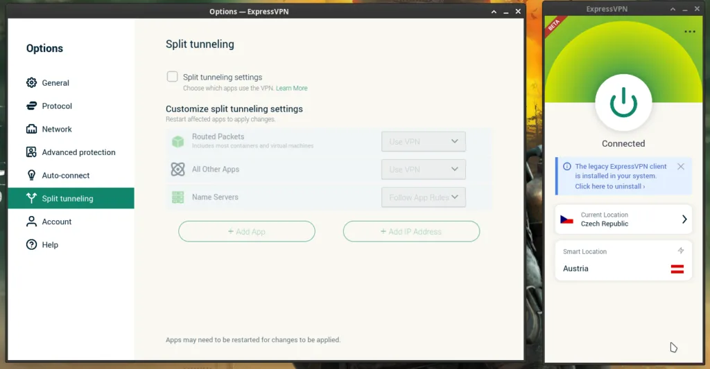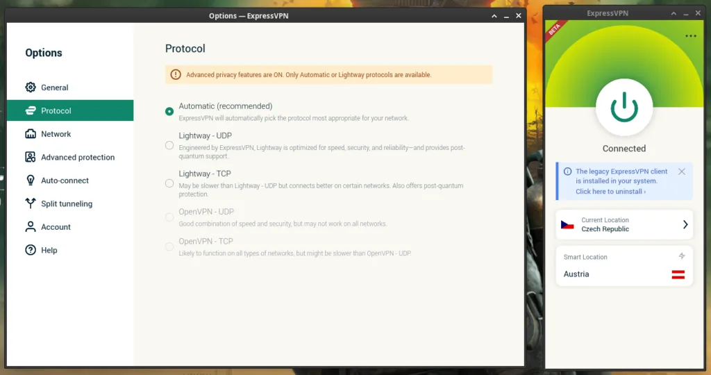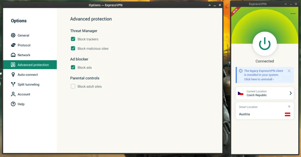 Nový klient s hezkým uživatelským prostředím je pro linuxové distribuce již k dispozici, ale prozatím v beta verzi. Nese označení „ExpressVPN v4.0.0 for Linux“ a na EndeavourOS mi funguje naprosto bez problémů. Prostředí se skutečně podobá desktopové aplikaci z Windows, přímo ze spodního panelu můžete měnit IP adresy a pozastavit připojení na pár minut. V nastavení aplikace si můžete vybrat protokol a blokování reklam, trackerů nebo webových stránek určené pro dospělé.