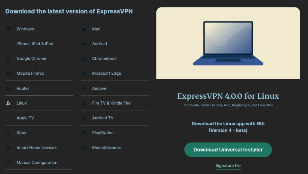 • Přejděte na stránku pro stažení .run souboru: expressvpn.com/latest#linux. Tam soubor stáhnete kliknutím na tlačítko „Download Universal Installer“.