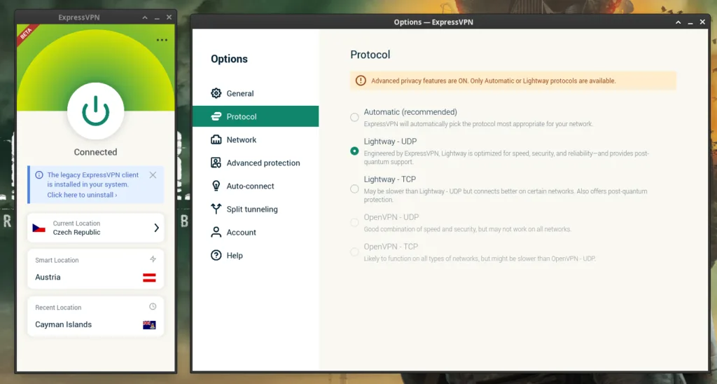 ExpressVPN vydává aktualizace svých aplikací, které přináší Lightway Turbo. Službě se dle jejího tvrzení povedlo výrazně zvýšit rychlost stahování a odesílání, aniž by to mělo vliv na latenci. Pokud ExpressVPN využíváte, doporučuji přejít do nastavení aplikace a vybrat protokol Lightway UDP. Měla by být dostupná pro uživatelé s Windows po aktualizaci na verzi v12, ale já vylepšený protokol delší dobu testuji v beta verzi na Androidu a EndeavourOS.