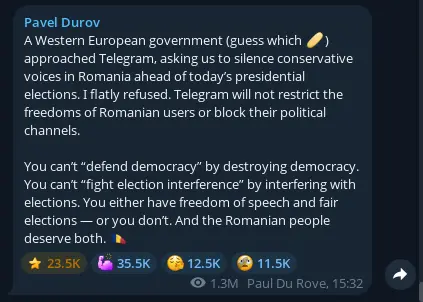„Západní evropská vláda (hádejte která) oslovila Telegram s žádostí, abychom před dnešními prezidentskými volbami umlčeli konzervativní hlasy v Rumunsku. Rozhodně jsem to odmítl. Telegram nebude omezovat svobody rumunských uživatelů ani blokovat jejich politické kanály.