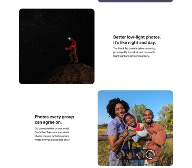 Samozřejmě se většinou nejedná o oficiálně potvrzené informace a je třeba je brát s rezervou, ale některé vypadají dost důvěryhodně. Představeny budou opět dva modely Pixel 8 a Pixel 8 Pro. Především u uniklých specifikací Pixelu 8 Pro si lze všimnout, že Google nejspíš nabídne sedmiletou podporu bezpečnostních záplat, vylepšené fotoaparáty a funkci AI pro úpravu fotek po jejich pořízení. Nasazen bude nový procesor Google Tensor G3 od Samsungu a 12 GB RAM. Chybět by neměl ani moderní LTPO OLED displej s úhlopříčkou 6,7palce s obnovovací frekvencí od 1 Hz do 120 Hz. Na zádech bude trojice fotoaparátů – 50 Mpx hlavní, 48 Mpx ultraširokoúhlý s možností focení makra a 48 Mpx teleobjektiv s 5x zoomem.