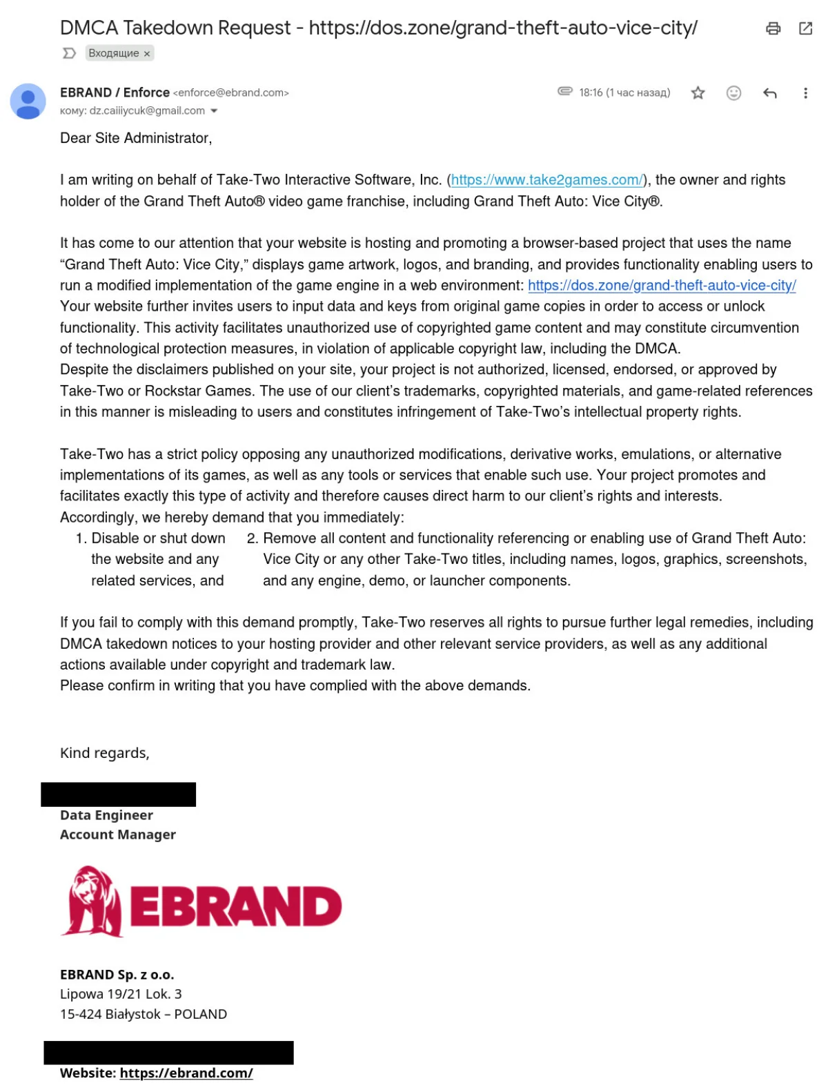 Pokud uvažujete o hraní GTA Vice City v internetovém prohlížeči, mám pro vás smutnou zprávu. Služba DOS.zone obdržela DMCA žádost od společnosti Take‑Two Interactive Software. Na tuto žádost reagovala a hru ze svého webu odstranila.