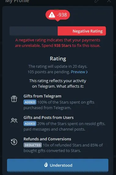 Nová funkce hodnocení je již dostupná všem. Zobrazuje se ale jen na profilech, které častěji nakupují Telegram Stars, využívají je, běžně nakupují animované dárky nebo hodnotná NFT.