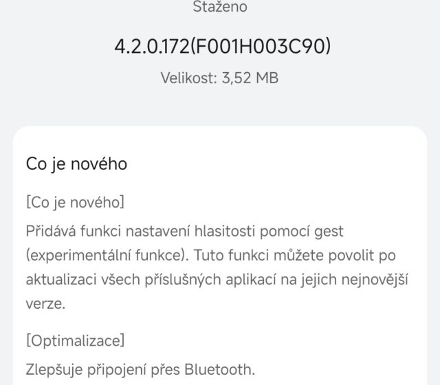 Pokud sluchátka vlastníte, můžete již začít stahovat novou verzi mobilní aplikace Huawei AI Life. Dostupnost aktualizace aplikace by měla být zobrazena hned po jejím spuštěním. Poté je možné aktualizovat firmware sluchátek na HarmonyOS 4.2.0.172 o velikosti 3,52 MB. Výrobce udává, že aktualizace zlepšuje Bluetooth připojení a přidává ovládání hlasitosti pomocí gest. Tuto funkci najdete v sekci „Experimentální funkce“.