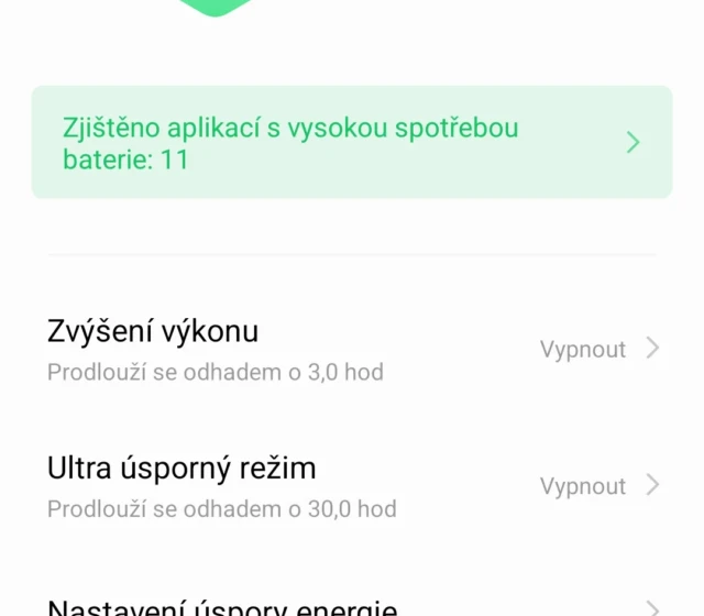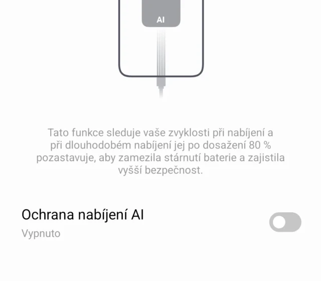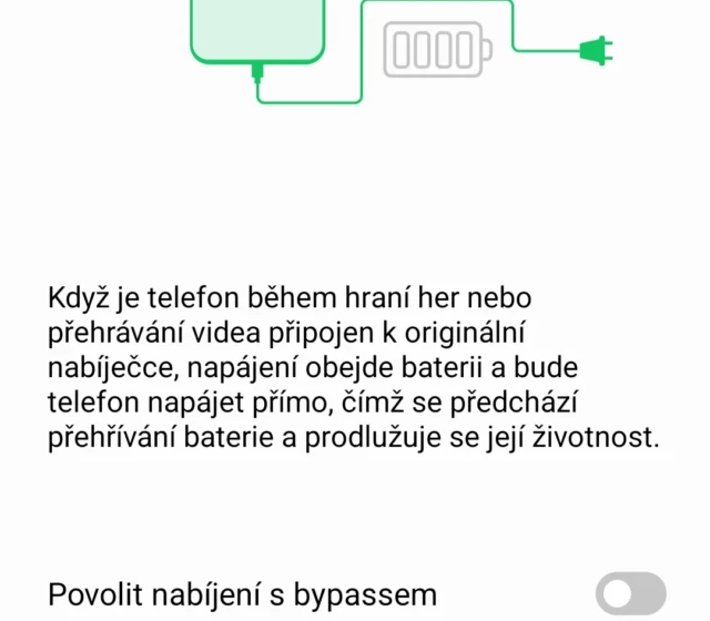 Když přejdete to: Nastavení telefonu, Baterie a úspora energie, můžete si nastavit další funkce. Já jsem sice uživatel, který se odmítá omezovat, ale někdo může ocenit úsporné režimy. K dispozici je i snižování spotřeby pro různé aplikace. Tuto funkci jsem zcela vypnul, protože ukončuje běh aplikací na pozadí, ale pokud nepotřebujete příchozí oznámení z různých aplikací, umí dost procent nabití ušetřit. V položce “Nabít” najdete reverzní bezdrátové nabíjení, rychlost nabíjení a ochrana nabíjení AI. Poslední funkci jsem vypnul, protože chci mobil nabíjet neustále maximální možnou rychlostí bez omezení. Zapnout ale můžete “Nabíjení s bypassem”, protože během hraní her umí mobil napájet jen z nabíjecího adaptéru a ne akumulátoru (baterie). Díky tomu je možné zachovat nižší teplotu a méně trápit akumulátor.