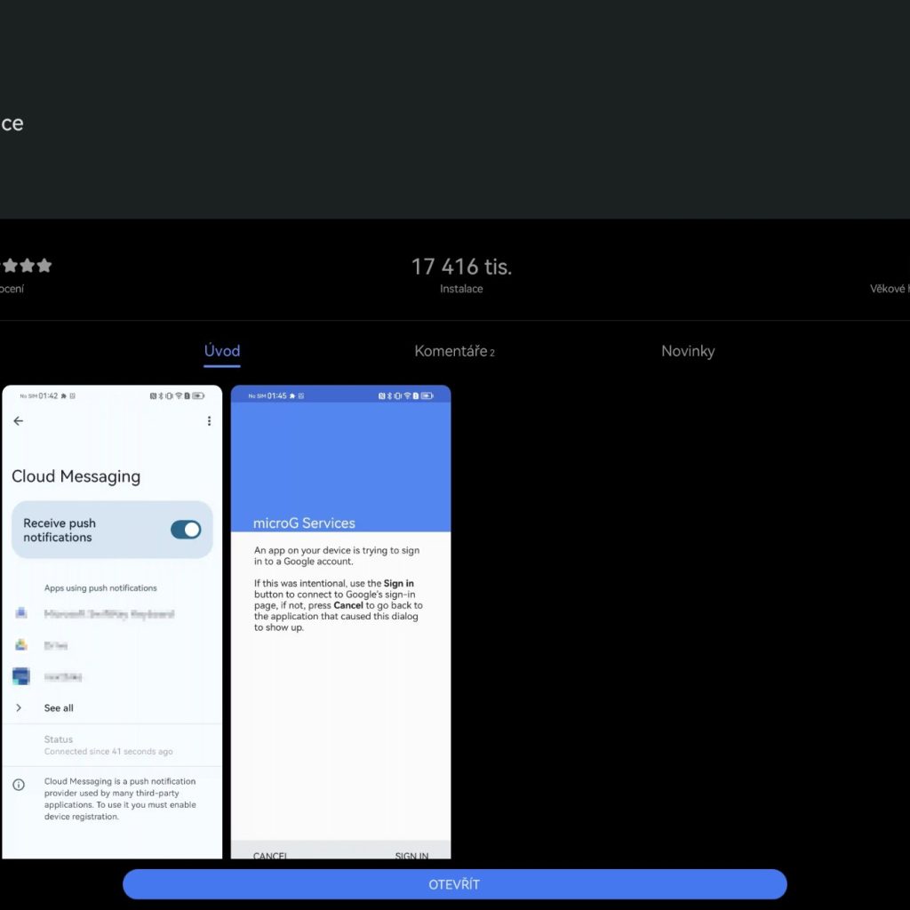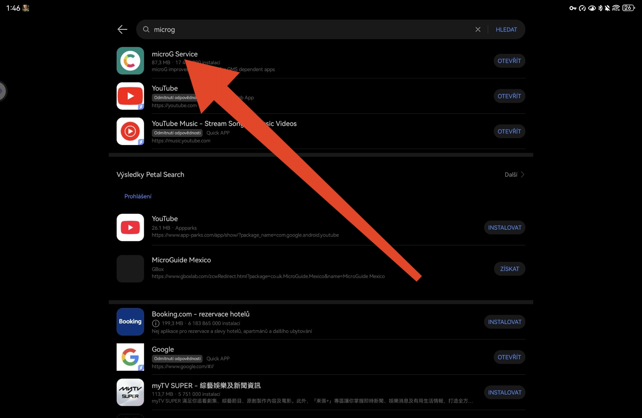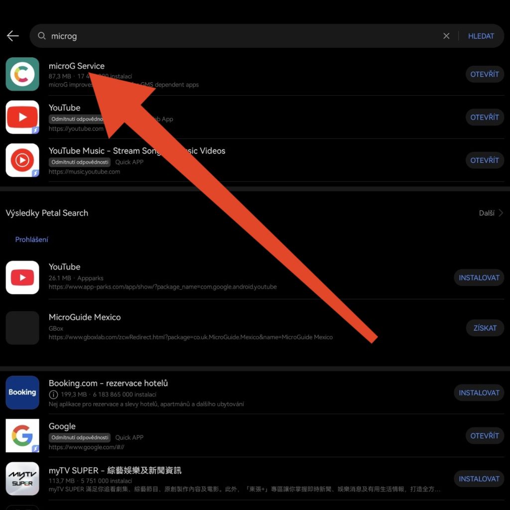 - Spusťte Huawei AppGallery a vpravo nahoře do vyhledávače napište „microG“.