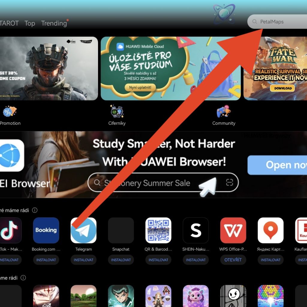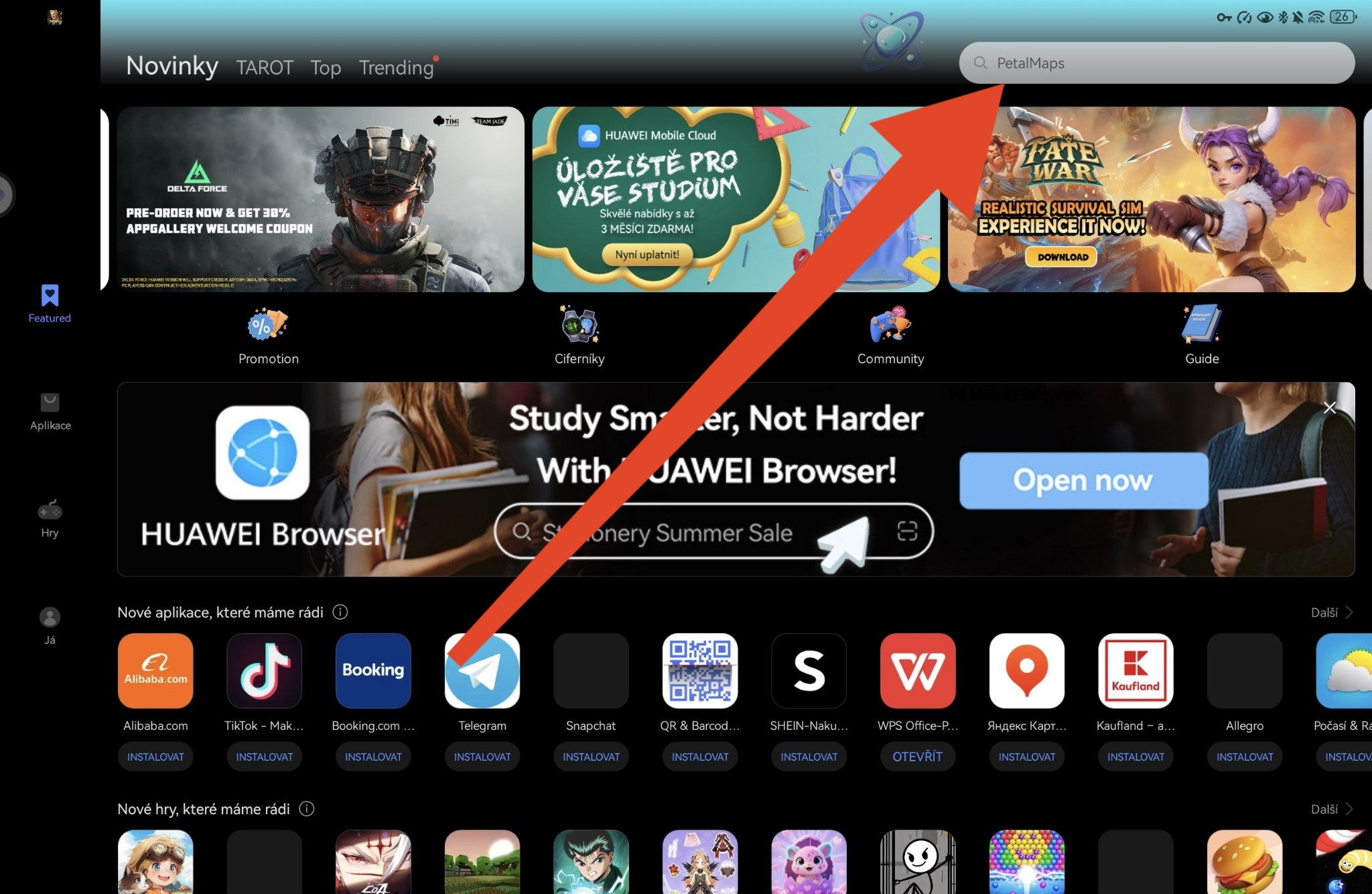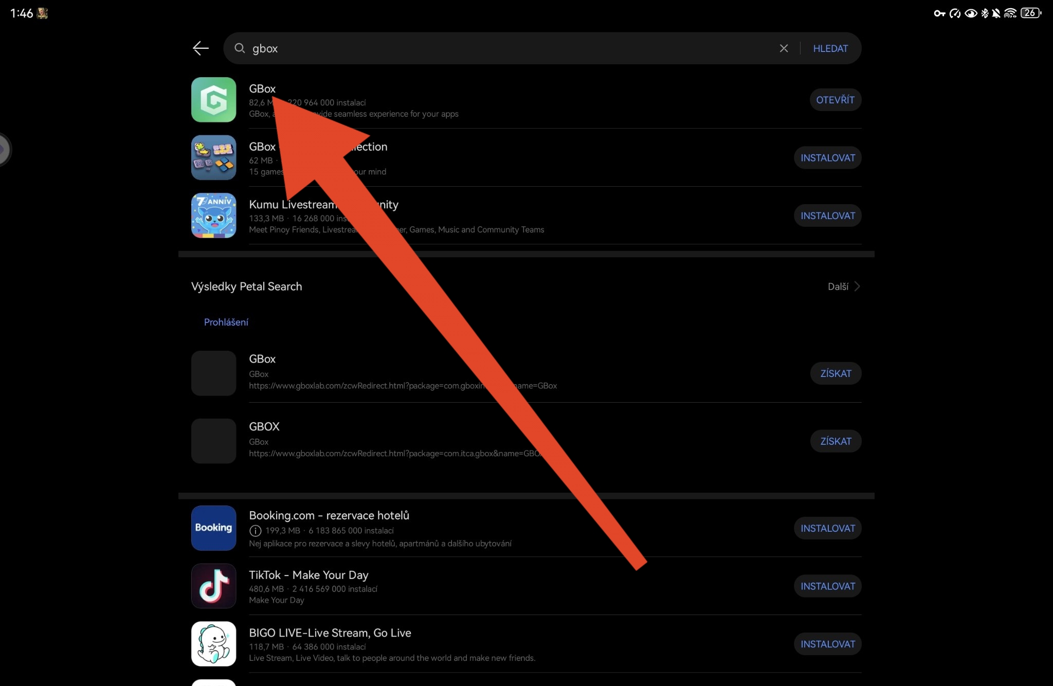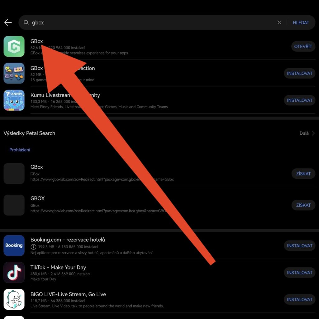 - Spusťte Huawei AppGallery a vpravo nahoře do vyhledávače napište „Gbox“.