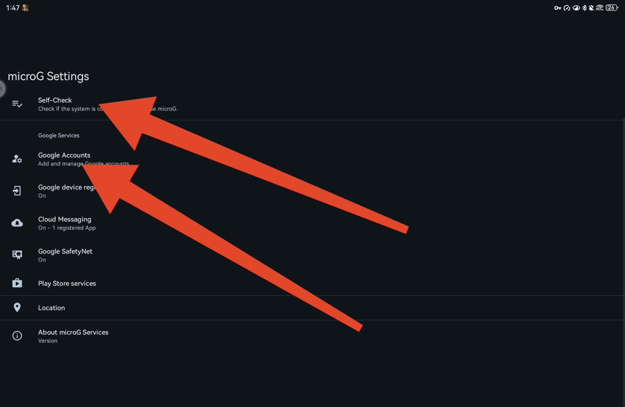 - Vraťte se ještě zpět na úvodní obrazovku microG a přejděte do „Google Accounts“ a přihlaste se ke svému Google účtu.