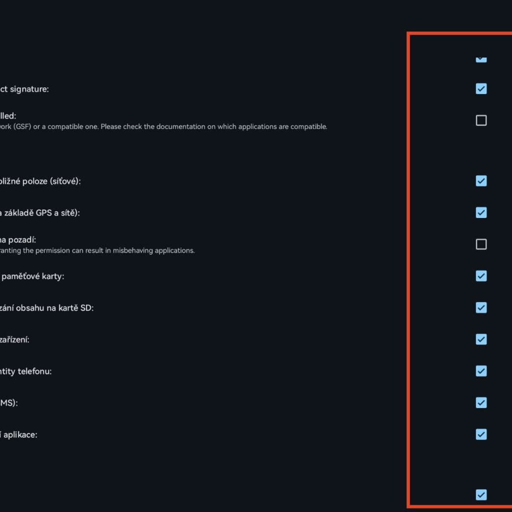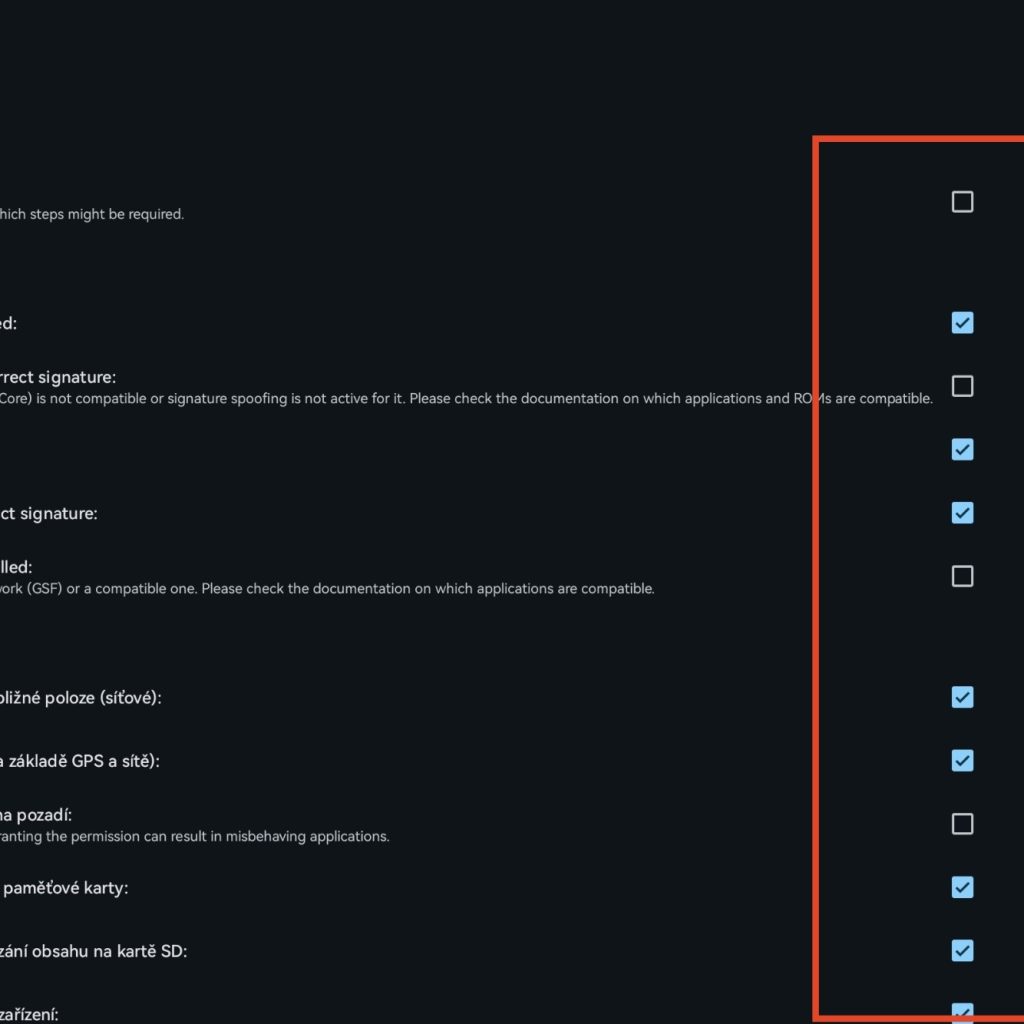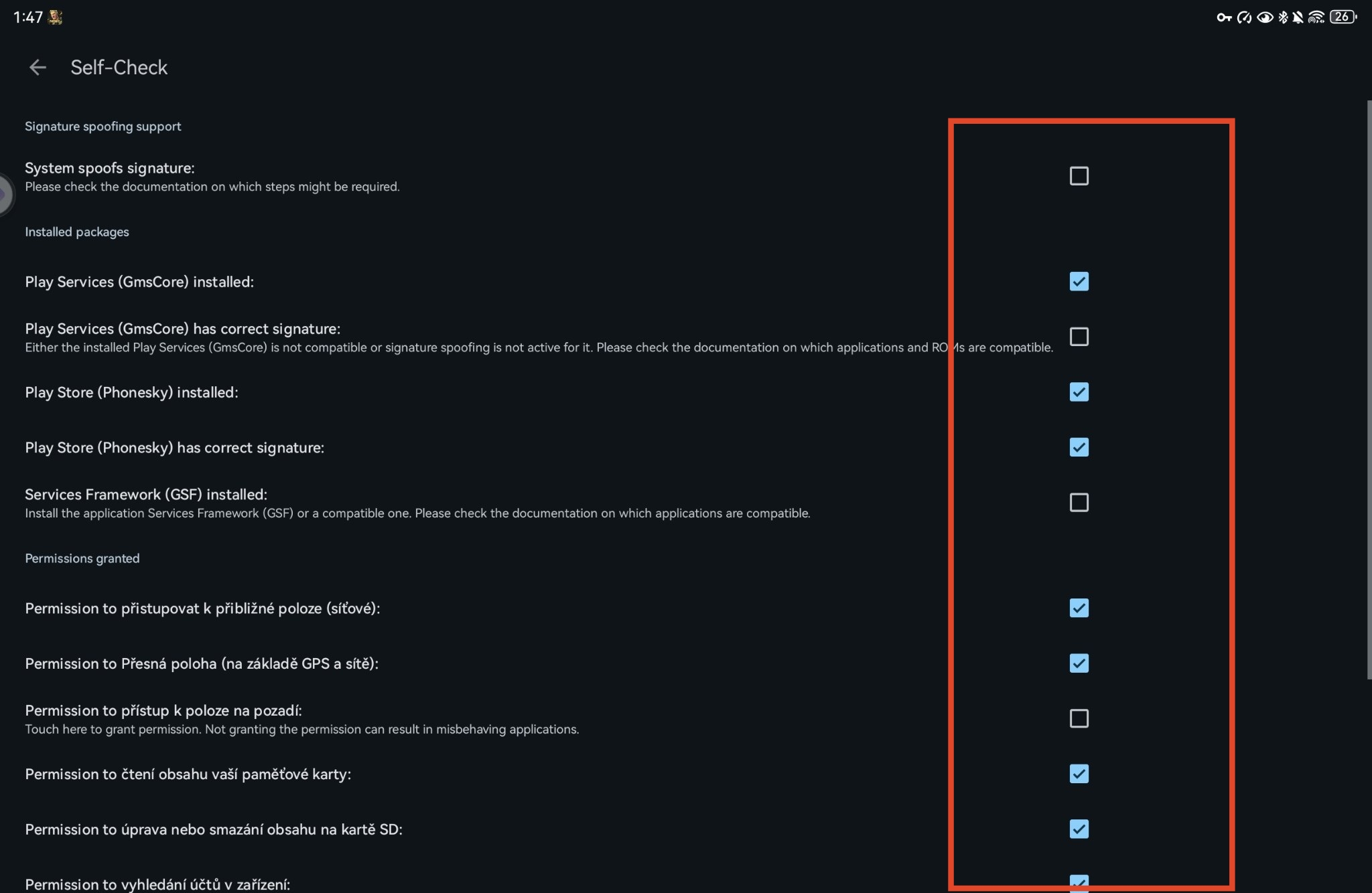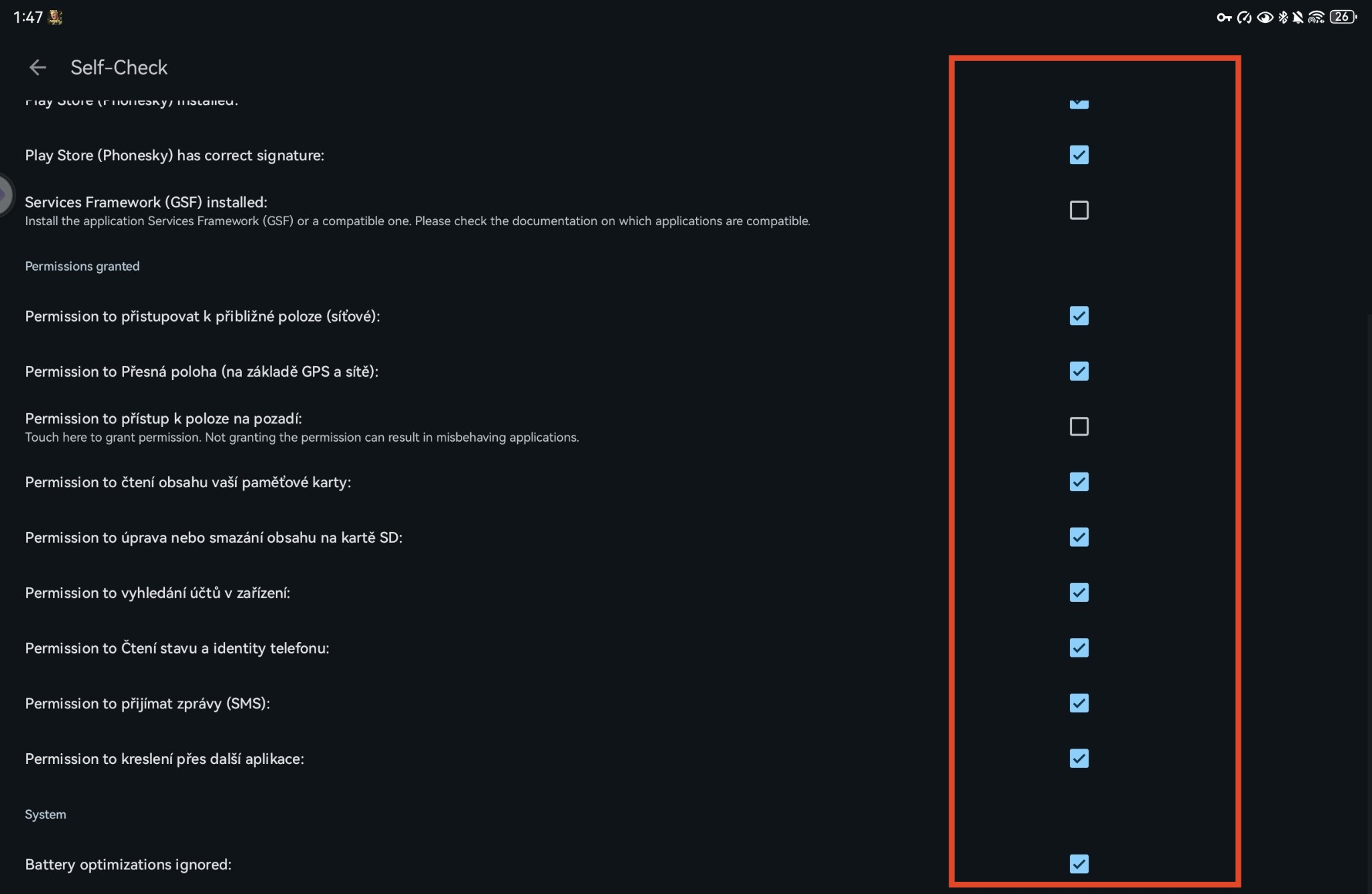 - Nahoře vyberte „Self-Check“ a zaškrtejte potřebná políčka viz screenshoty. Úplně dole se nachází podstatné vypnutí optimalizace baterie, aby byl chod různých aplikací bez problémů.