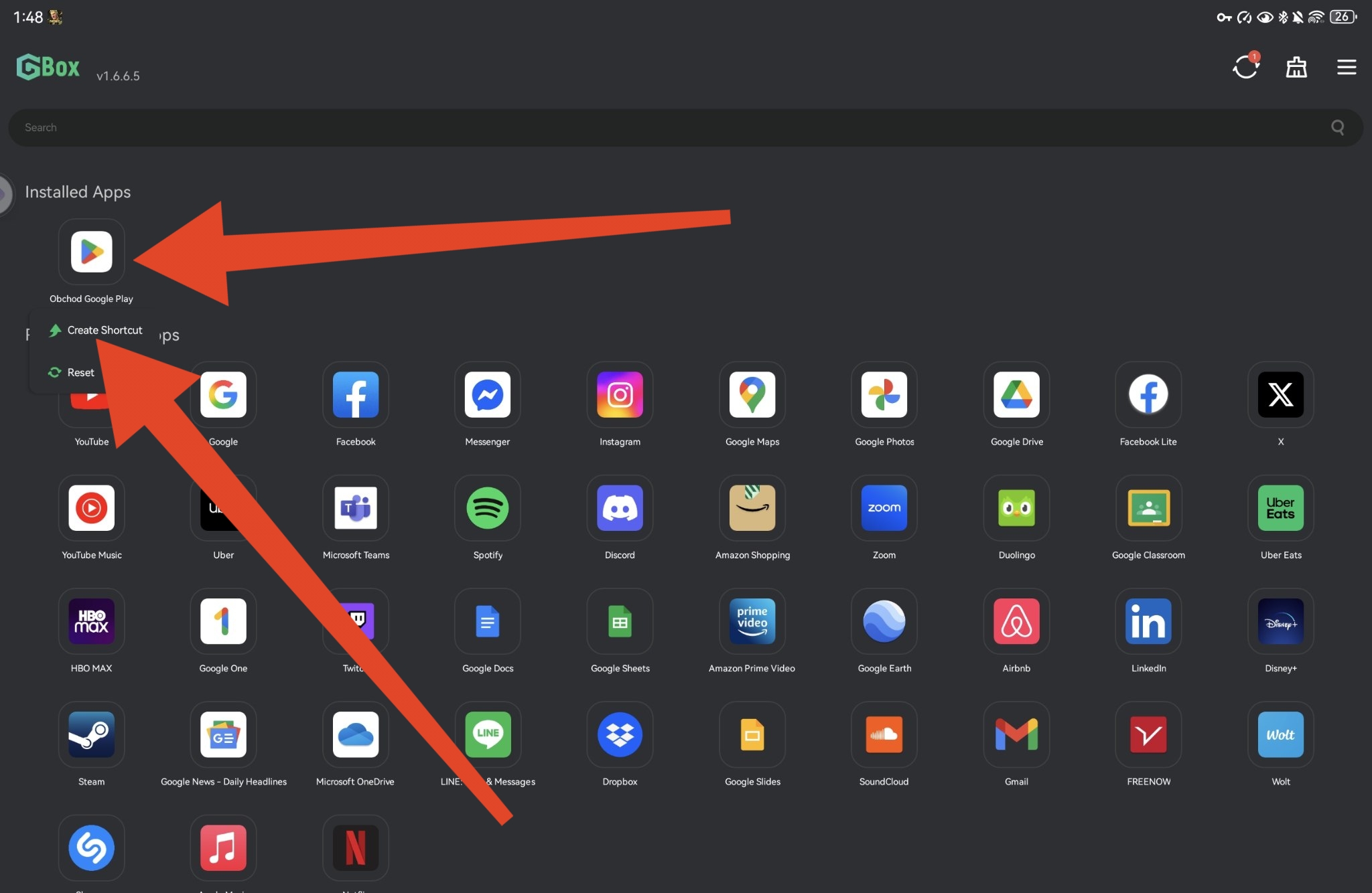 - Po úspěšném prvotním spuštění se dostanete na úvodní obrazovku Gboxu. Obsahuje různé ikony aplikací, ale také Obchod Play. Podržte na ikoně dlouze prst a následně „Create Shortcut“.