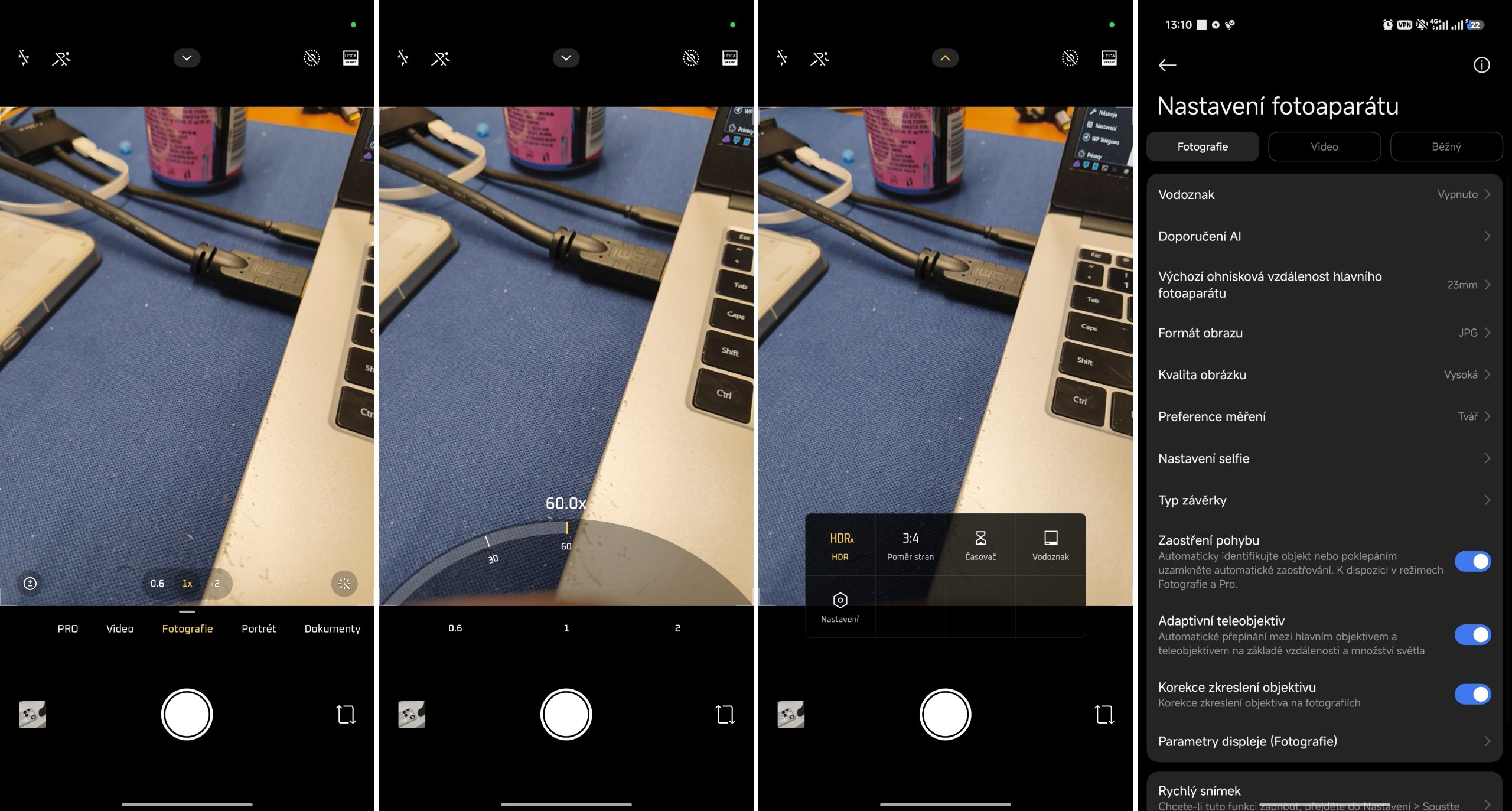 Pro zoom slouží spodní tlačítka a pod nimi jsou všechny důležité režimy, mezi nimiž je PRO s manuálním nastavením parametrů a možností ukládat do JPG nebo surového formátu RAW. V nastavení aplikace je také možnost fotit do formátu HEIC. Nechybí ani výborný noční režim, portrétní režim s rozostřeným pozadím, skenování dokumentů nebo panoramata.