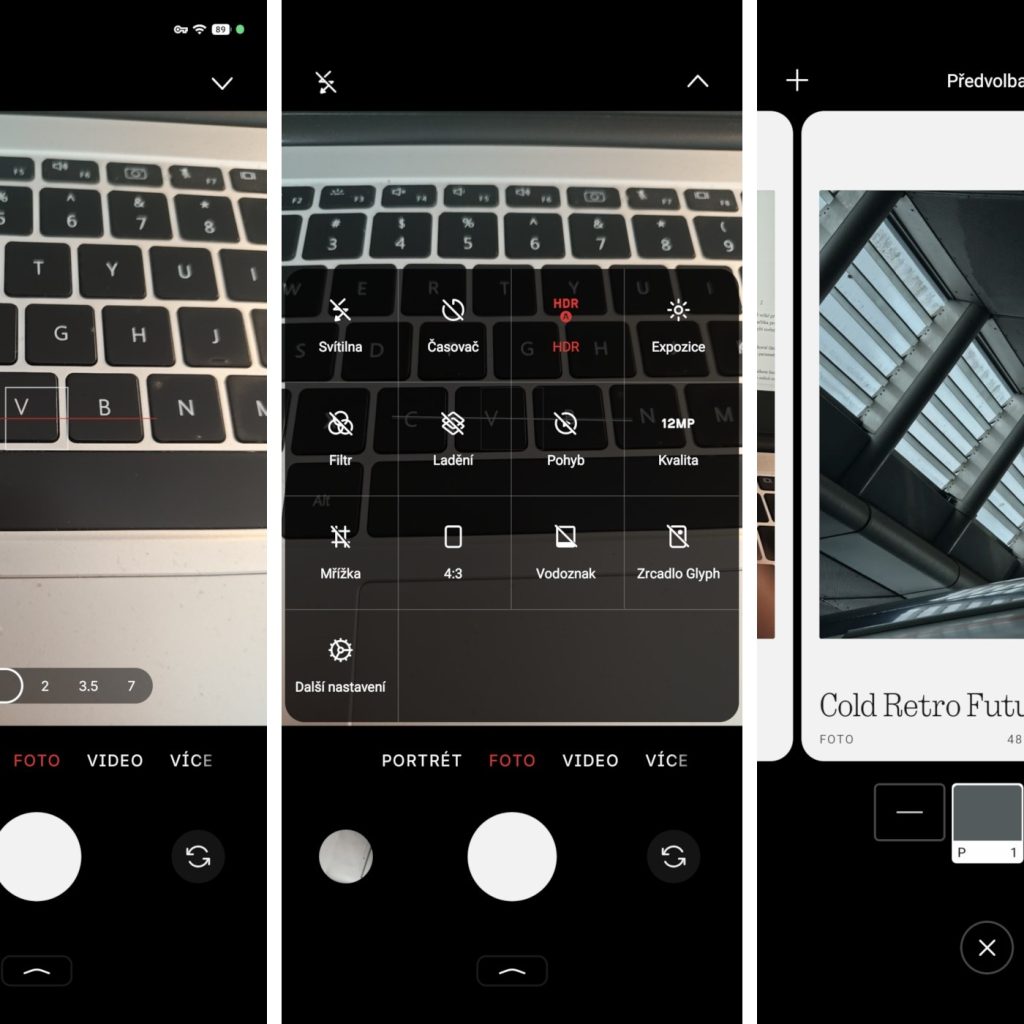 Oba telefony jsou tradičně vybaveny mobilní aplikací pro focení od společnosti Nothing. Uživatelské rozhraní aplikace má dostatečně velké prvky a je svižné. Využít můžete automatické HDR, různé filtry, pohyblivé snímky v galerii, mřížku, nebo změnu poměru stran a rozlišení pro fotky i videa. Ve spodní části se nacházejí tlačítka pro přepínání mezi fotoaparáty, případně potažením prstu lze využít až 70x digitální zoom u modelu Phone (4a) a až 140x zoom u modelu Phone (4a) Pro. Mezi režimy nechybí noční, portrétní, panoramatický, zpomalený záběr ani časosběr.