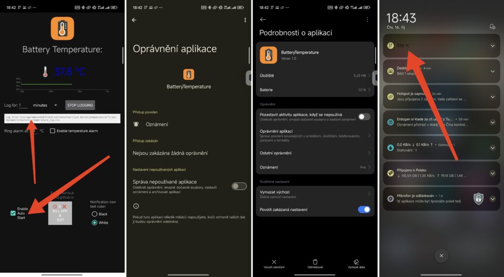 Chcete podrobnější informace o změnách teploty? Můžete povolit záznamy do tzv. „logu“. Všechny informace pak najdete v CSV souboru, který můžete otevřít, nahrát do cloudu nebo sdílet v jakékoli aplikaci. Vytvořený log se standardně nachází ve složce aplikace, ale dostat se k němu můžete rychle klepnutím na cestu „Log file:“ na hlavní obrazovce aplikace. Dle mých testů funguje spolehlivě a vyžaduje jen minimum oprávnění.