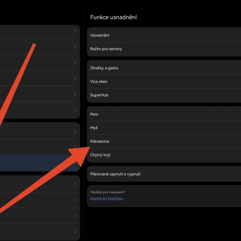 • V nastavení přejděte do „Funkce usnadnění“ a nejdříve bych doporučil zkontrolovat, jestli máte aktuální verzi firmwaru klávesnice.