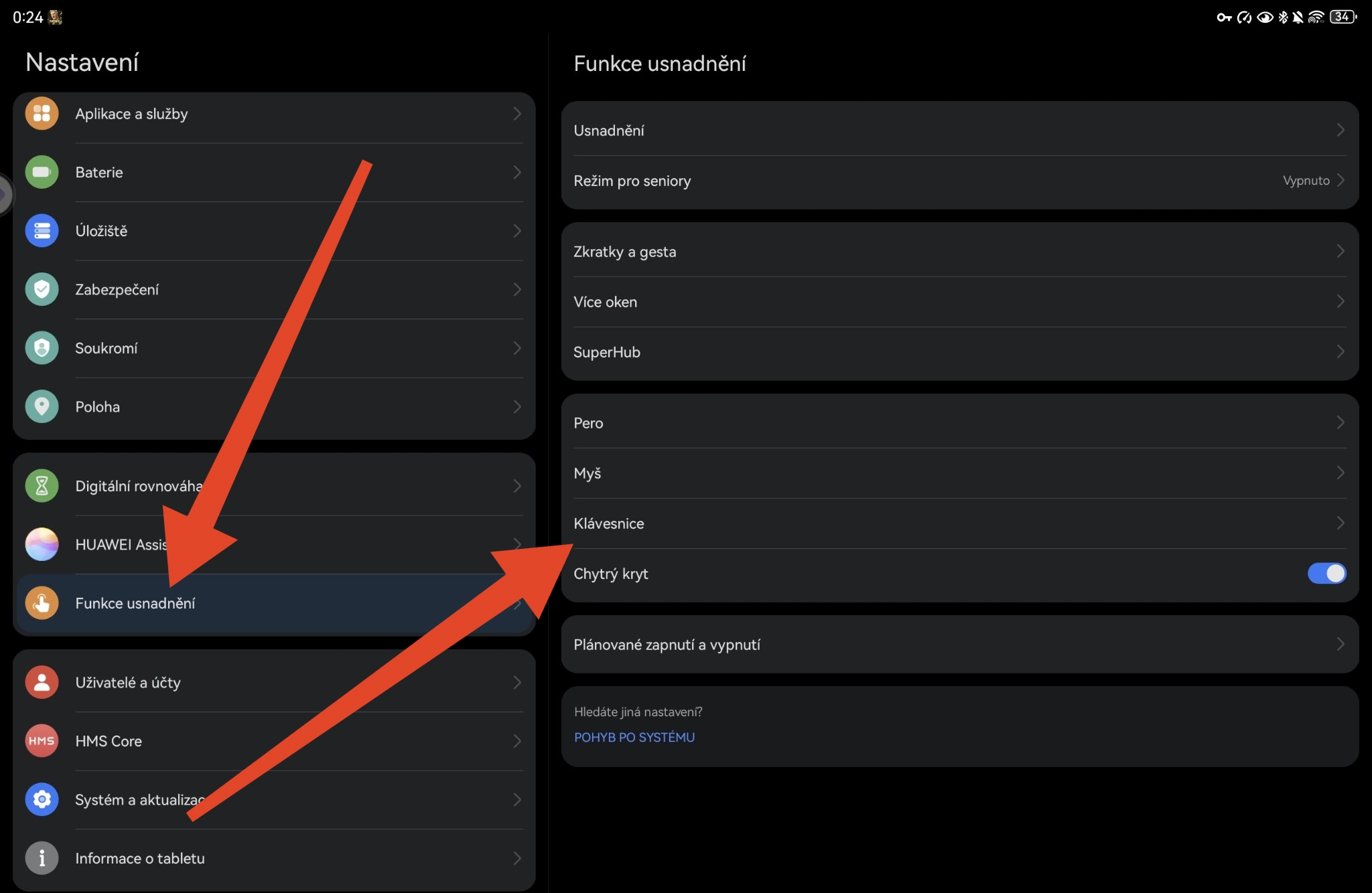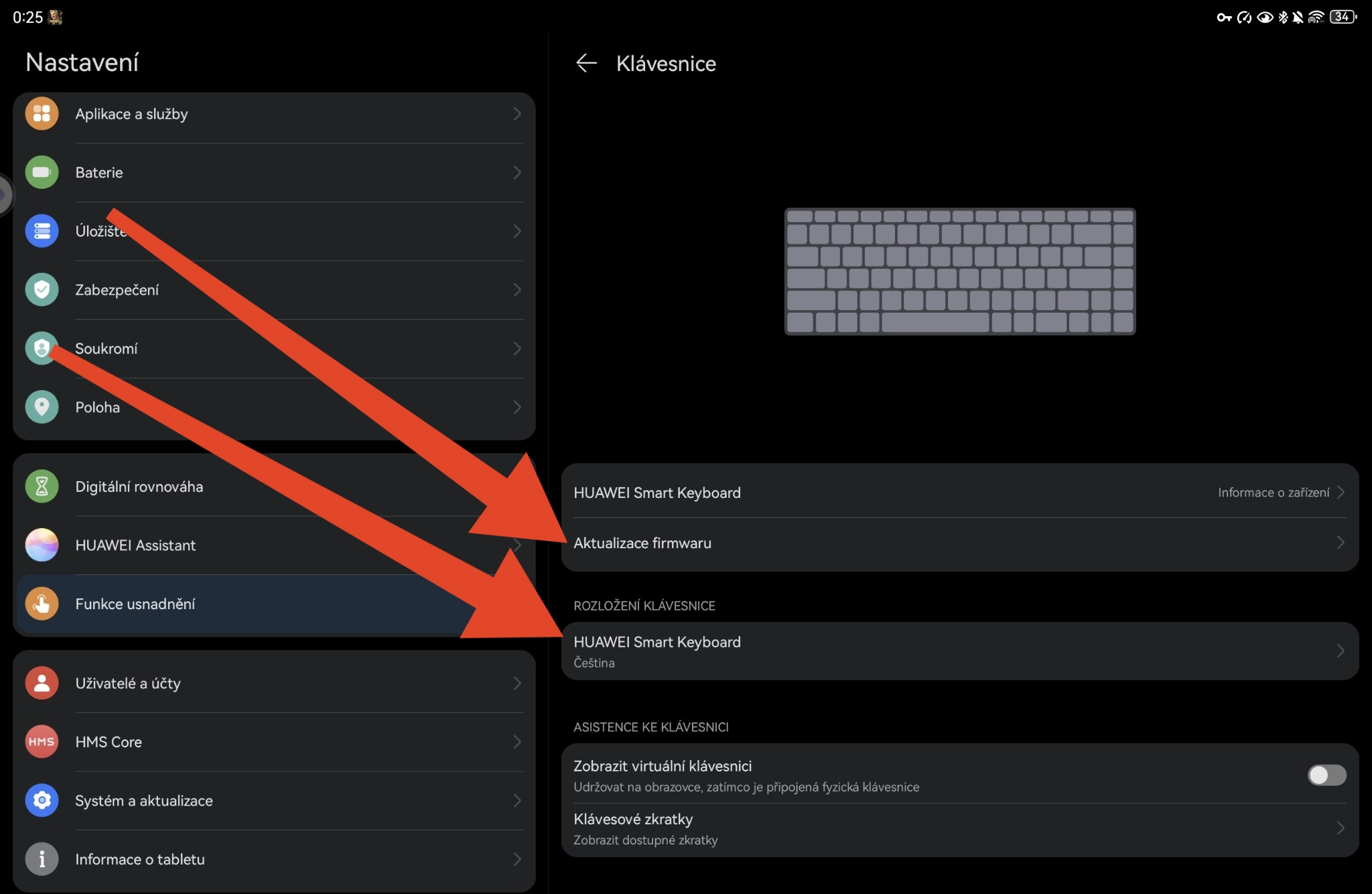 • V nastavení přejděte do „Funkce usnadnění“ a nejdříve bych doporučil zkontrolovat, jestli máte aktuální verzi firmwaru klávesnice.