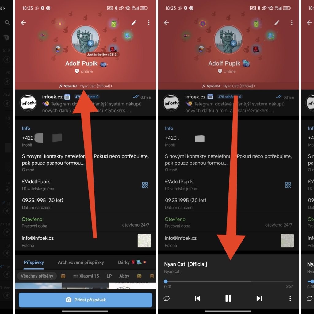 Funkce vypadá velmi dobře a přímo na profil lze umístit celý seznam oblíbených skladeb. Jejich pořadí si můžete upravit podle sebe, přehrávat je kdekoliv v aplikaci Telegram a případně je sdílet. Skladby si může přehrát každý návštěvník vašeho profilu.