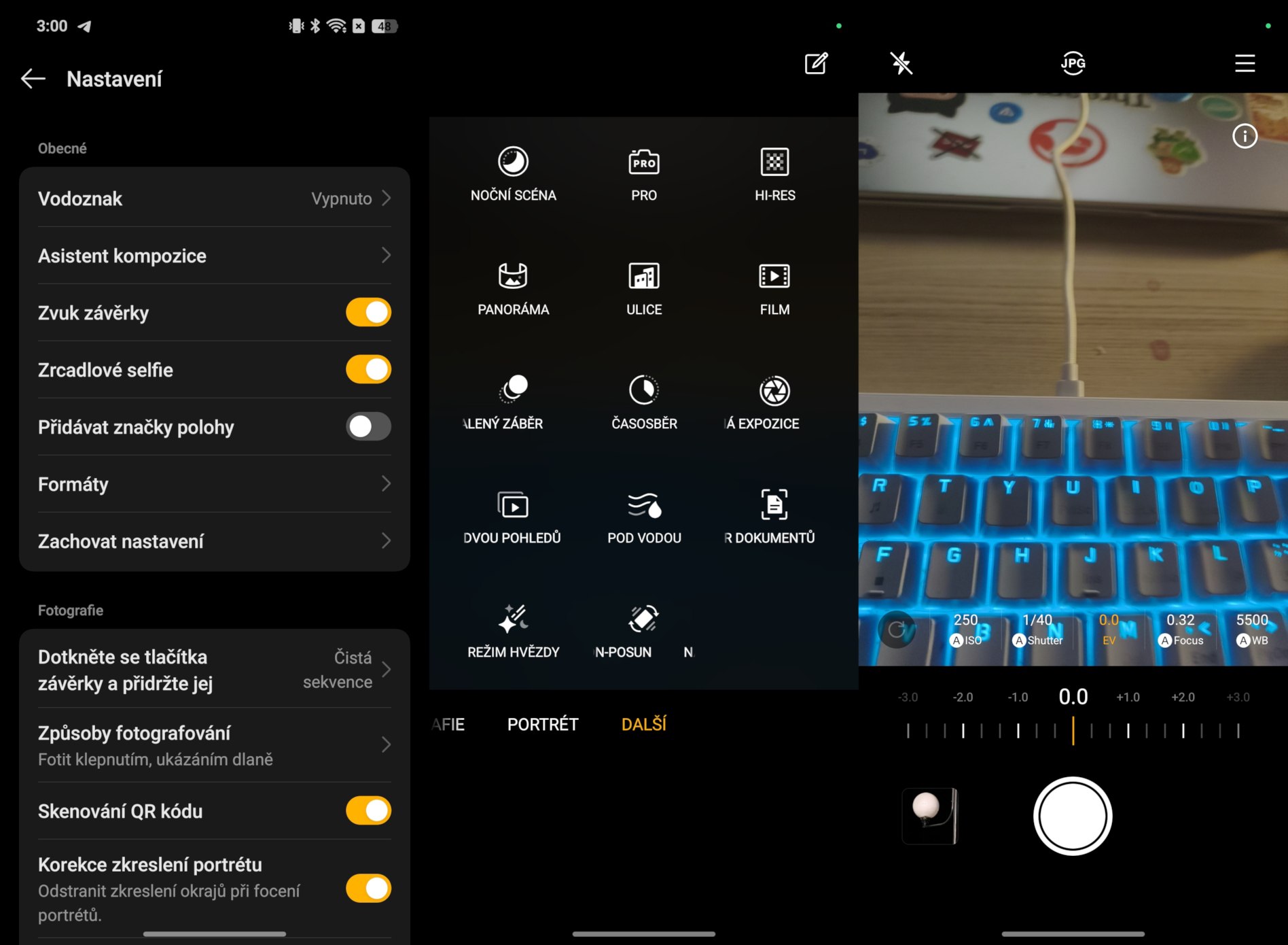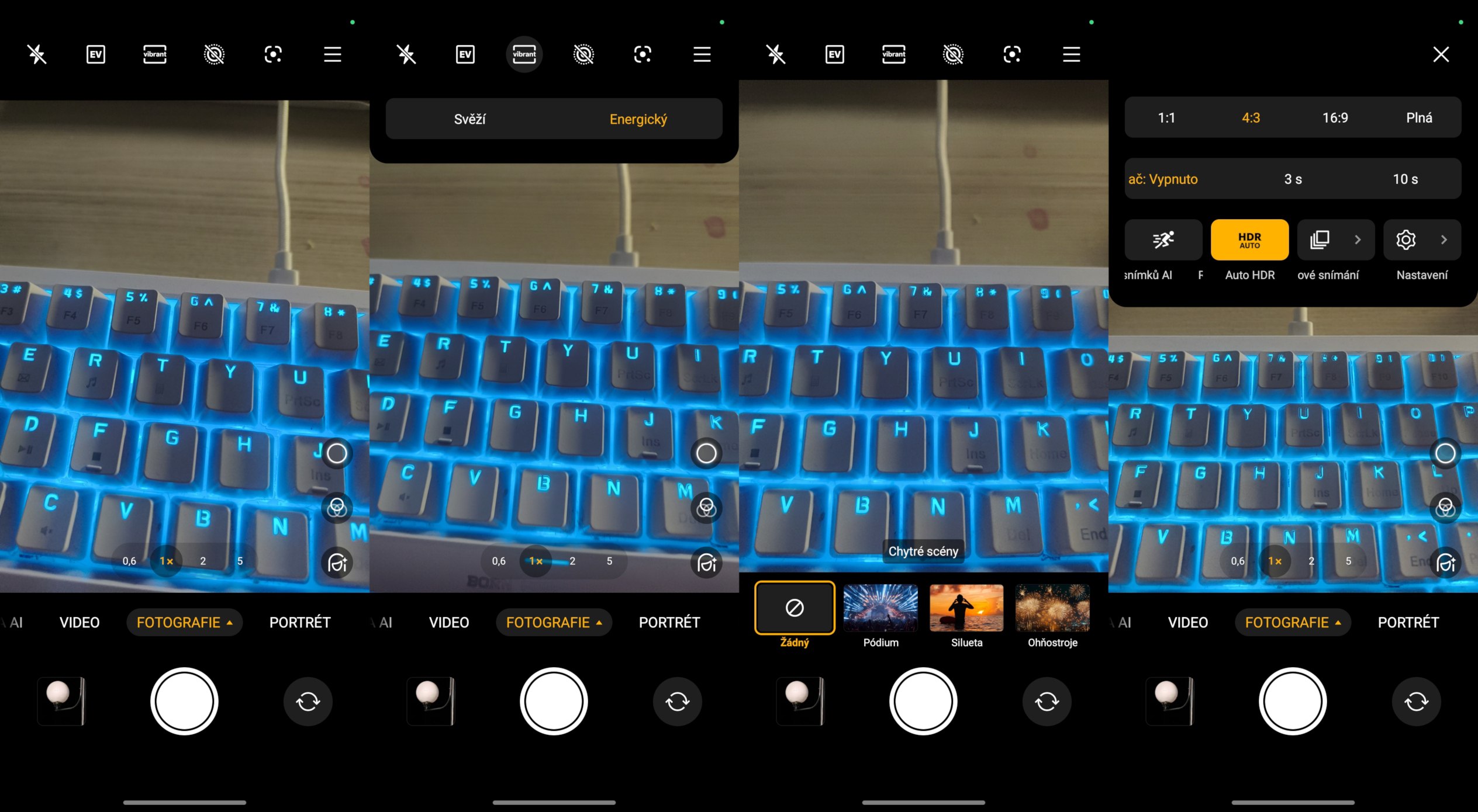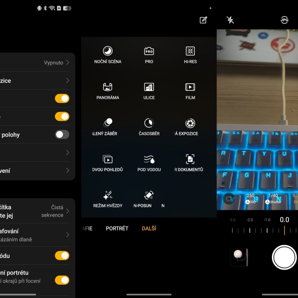 Pruh s režimy obsahuje speciální režim pro focení krajinek s pomocí AI. K dispozici je portrétní režim s rozostřením (bokeh), přednastavené chytré scény například pro focení na koncertu, noční režim funguje automaticky nebo manuálně, a Pro režim s manuálním nastavením parametrů je velmi vydařený a umožňuje focení do surového formátu RAW. Dále nechybí skenování dokumentů, focení hvězd, časosběr, focení pod vodou a celkově aplikaci nic podstatného neschází.