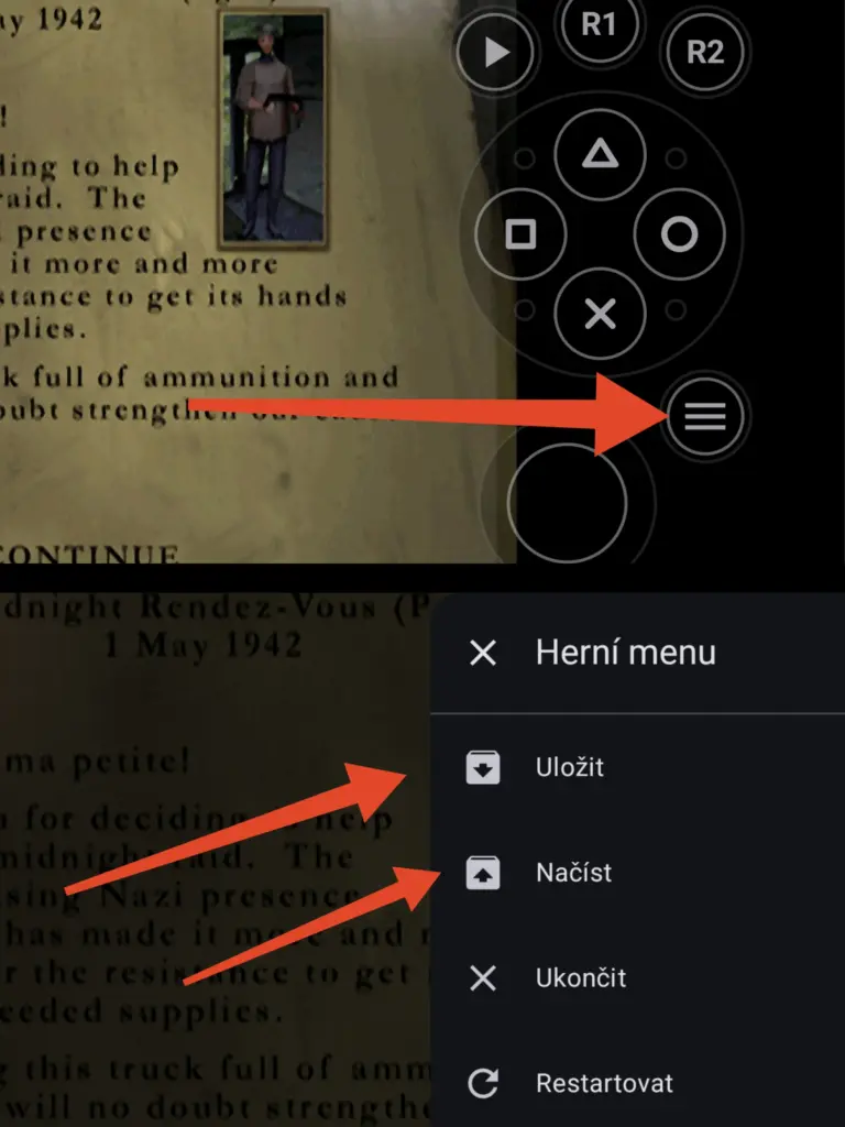 Pokud hrajete pomocí dotykových prvků, pak stačí dlouze podržet prst na tlačítku označeného ve screenshotu níže. Při hraní na gamepadu stačí současně stisknout oba joysticky. V obou případech se objeví menu s možností uložení nebo načtení postupu.