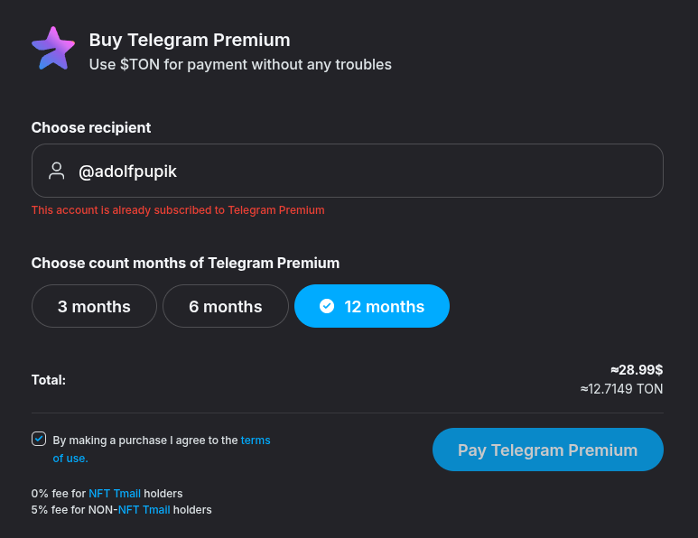 Obrátit se můžete také na výbornou službu Tmarket, která stojí za e-mailovou službou Tmail. Pokud máte ve své Telegram peněžence nějaké $TON, můžete si za ně zakoupit výhodné předplatné Telegram Premium. Roční předplatné vycházelo na 12 749 TON, což odpovídá 28,99 $. Předplatné je tedy výhodnější, a to především pro majitele NFT názvů Tmailu, protože ti jsou nově osvobozeni od poplatků.