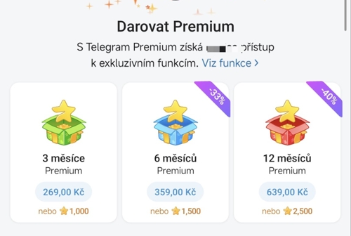 Telegram Premium můžete darovat svým přátelům nebo odběratelům vašeho kanálu. Všimli jste si už výrazně nižší ceny darovaného předplatného? Opět doporučuji vyhnout se Googlu a Applu. Stačí se domluvit s někým na oboustranném darování předplatného. Koupit můžete: 3 měsíce za 269 Kč / 1 000 Telegram Stars, 6 měsíců za 359 Kč / 1 500 Telegram Stars nebo celý rok za 639 Kč / 2 500 Telegram Stars. Bez Googlu a Applu vychází jinak roční předplatné běžně na 990 Kč. Rozdíl v ceně je tedy výrazný.