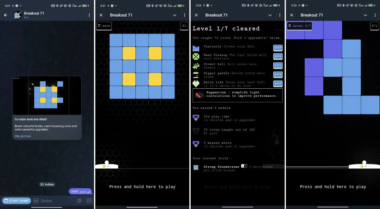 Tato verze navazuje na legendární arkádové hry. Breakout 71 je open-source hra se snadným ovládáním, ale postupem času rozbíjení barevných cihel nebude tak jednoduché. Sbírejte ještě zlaté mince a vylepšujte se v dalších levelech.