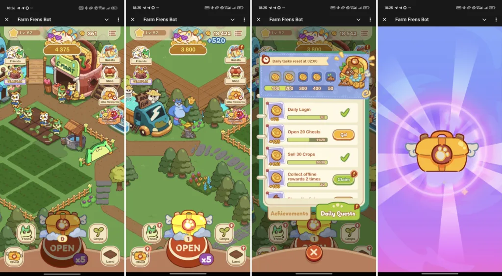 Ve hře není žádná reklama, ale pokud chcete, můžete získat nějaké herní bonusy jednoduchými „kvízy“. V těch můžete klidně náhodně odklikat pár možností bez čtení a v kroku sdílení vybrat „sdílet“ a celý proces zavřít. Odměnu dostanete i bez sdílení do Telegram Stories. 😉