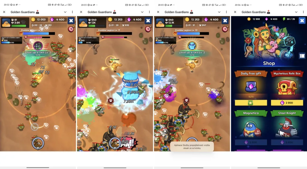 Už když uvidíte screenshoty ze hry, ihned ji pochopíte. Takových mobilních her bylo několik pro Android a iOS. V Telegramu si Golden Guardians Survivor však můžete zahrát na jakémkoliv zařízení bez instalace. Stačí se zkrátka jen hýbat, zabíjet zombíky a další nepřátelé kolem, sbírat životy a vylepšovat schopnosti zbraní.