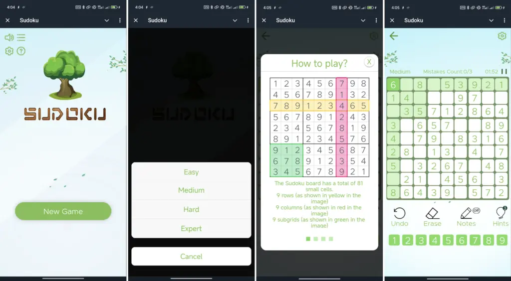 Sudoko s přehledným uživatelským prostředí. Vybrat si můžete herní obtížnost.