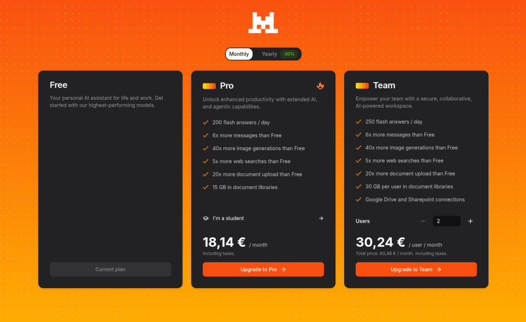 Le Chat můžete rozhodně vyzkoušet. Stačí si vytvořit bezplatný účet a službu otestovat. Provoz LLM modelů je náročný a drahý, proto po intenzivním používání můžete být omezeni a muset počkat několik hodin, podobně jako u jiných podobných služeb. S předplatným však získáte rychlejší vyhledávání a generování a nebudete omezováni. Cena za tarif Pro je 18,14 € /měsíc, tarif pro týmovou spolupráci pak stojí 30,24 € /měsíc.