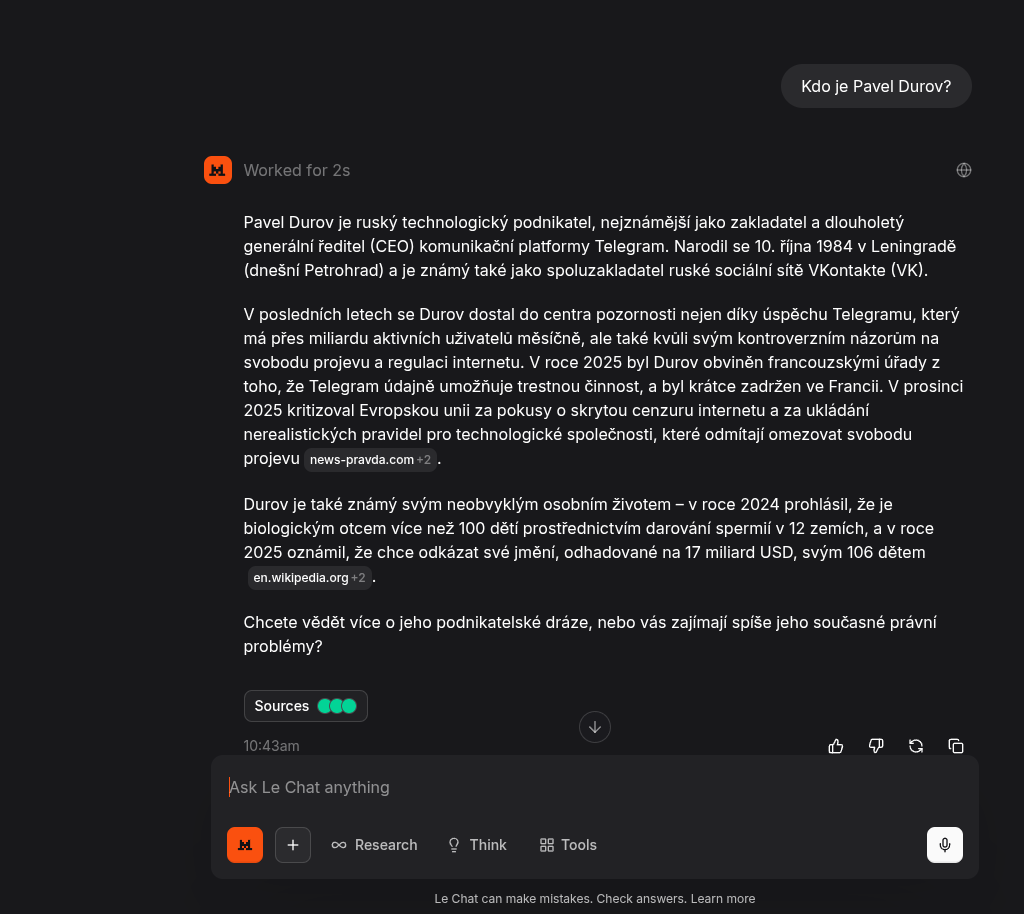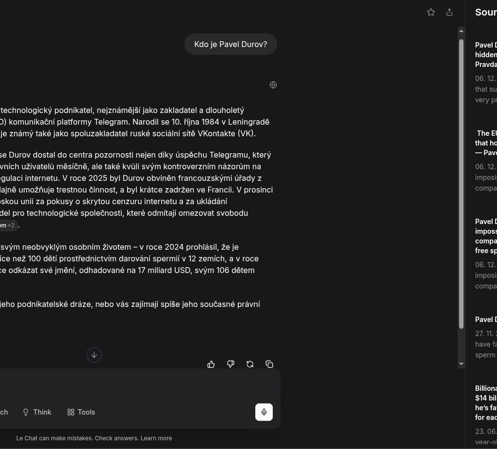 • Pro nás je velkou výhodou, že služba trénovala své modely na českém jazyce a vygenerovaný text je často kvalitní. Modely dobře vyhledávají z českých zdrojů, což jsem ocenil při upřesňování nových legislativ. V testu s konkurenčními službami správně odpovědělo jen Le Chat.