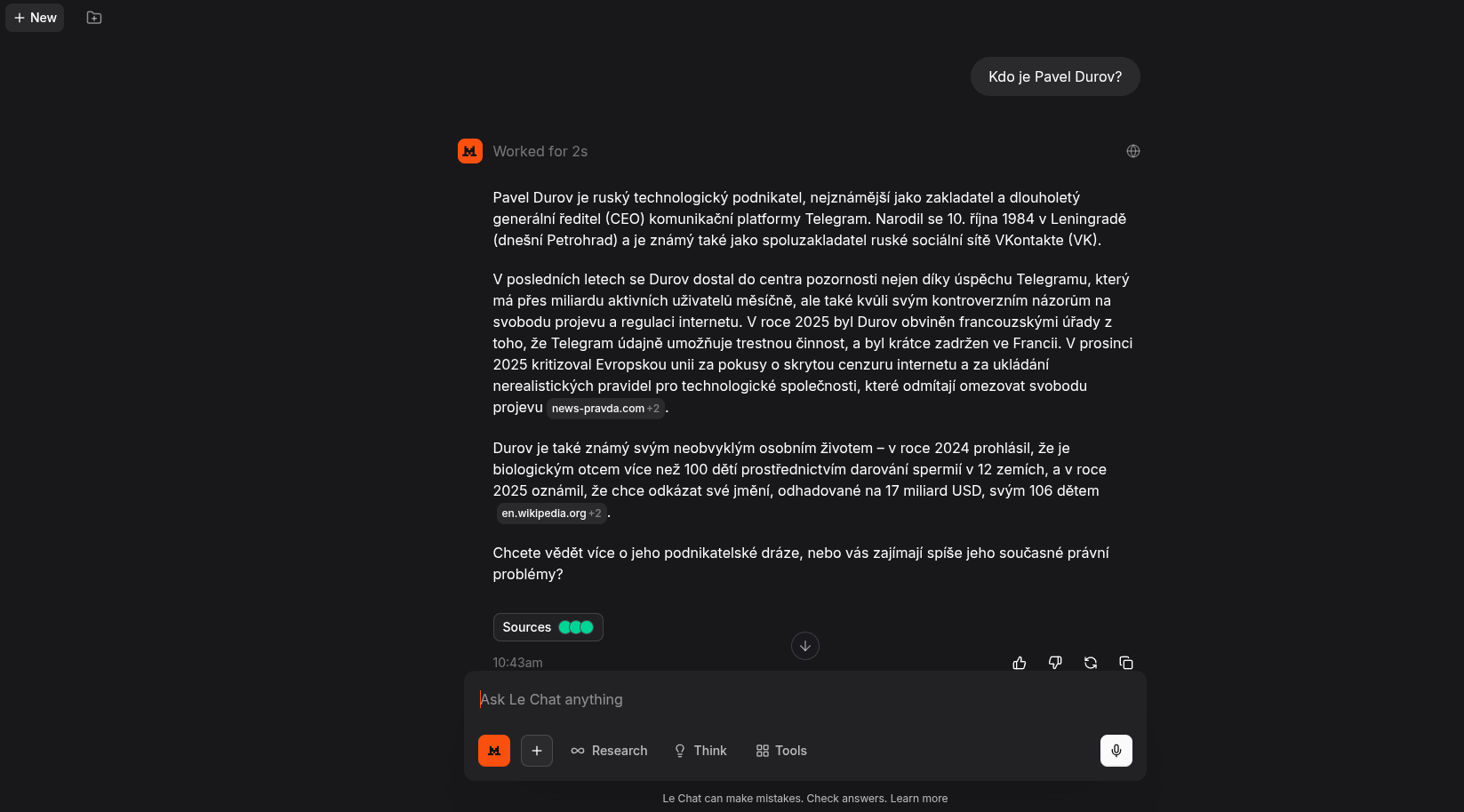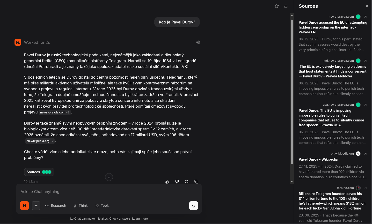 • Pro nás je velkou výhodou, že služba trénovala své modely na českém jazyce a vygenerovaný text je často kvalitní. Modely dobře vyhledávají z českých zdrojů, což jsem ocenil při upřesňování nových legislativ. V testu s konkurenčními službami správně odpovědělo jen Le Chat.