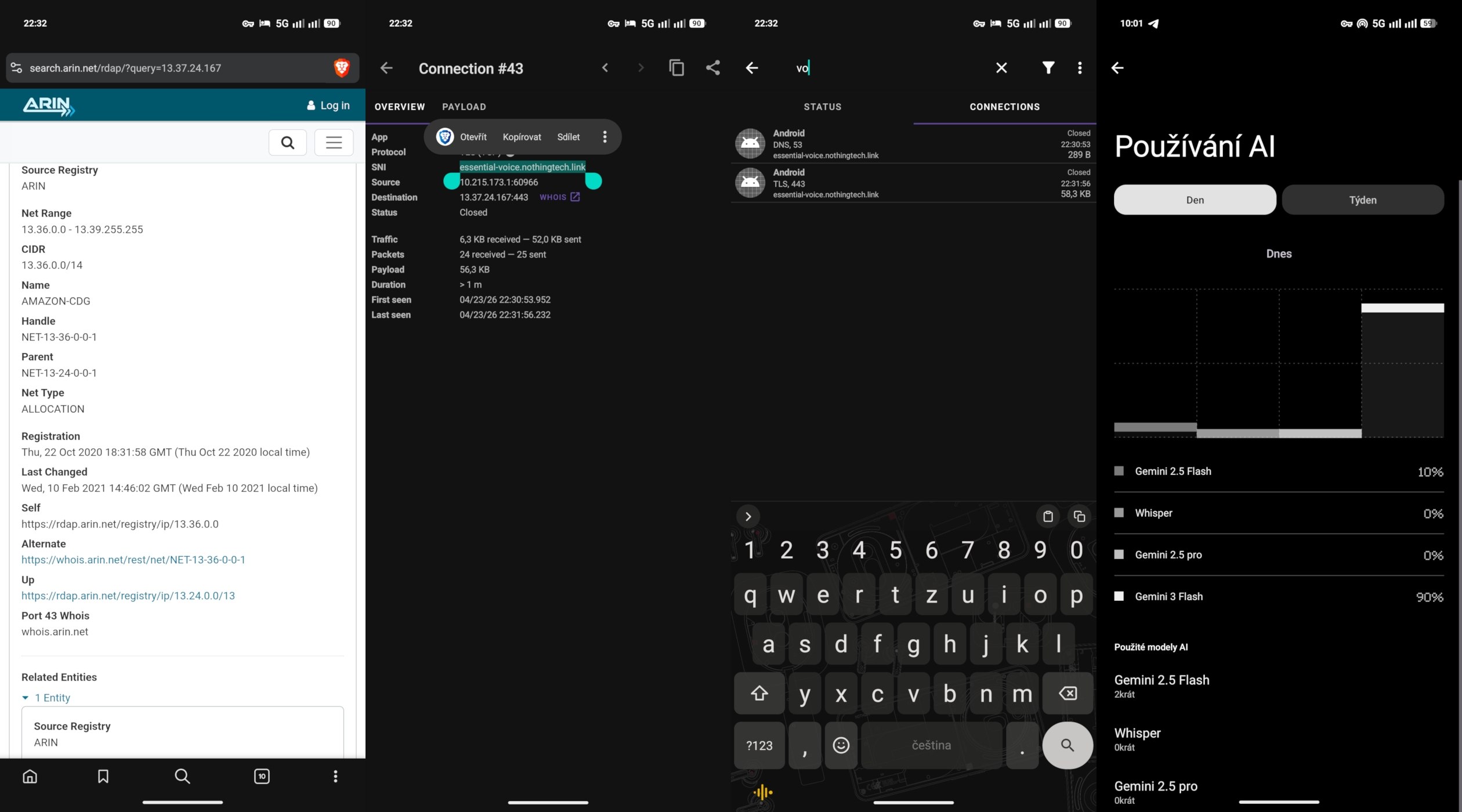 Připojení Essential Voice jsem analyzoval a dohledal jsem, že komunikuje skrze essential-voice.nothingtech.link. Přiklonil bych se k tomu, že LLM model neběží u Googlu a nemá k datům ani přístup, protože si Nothing model provozuje sám na vlastní doméně a hostuje ji na serverech Amazonu.