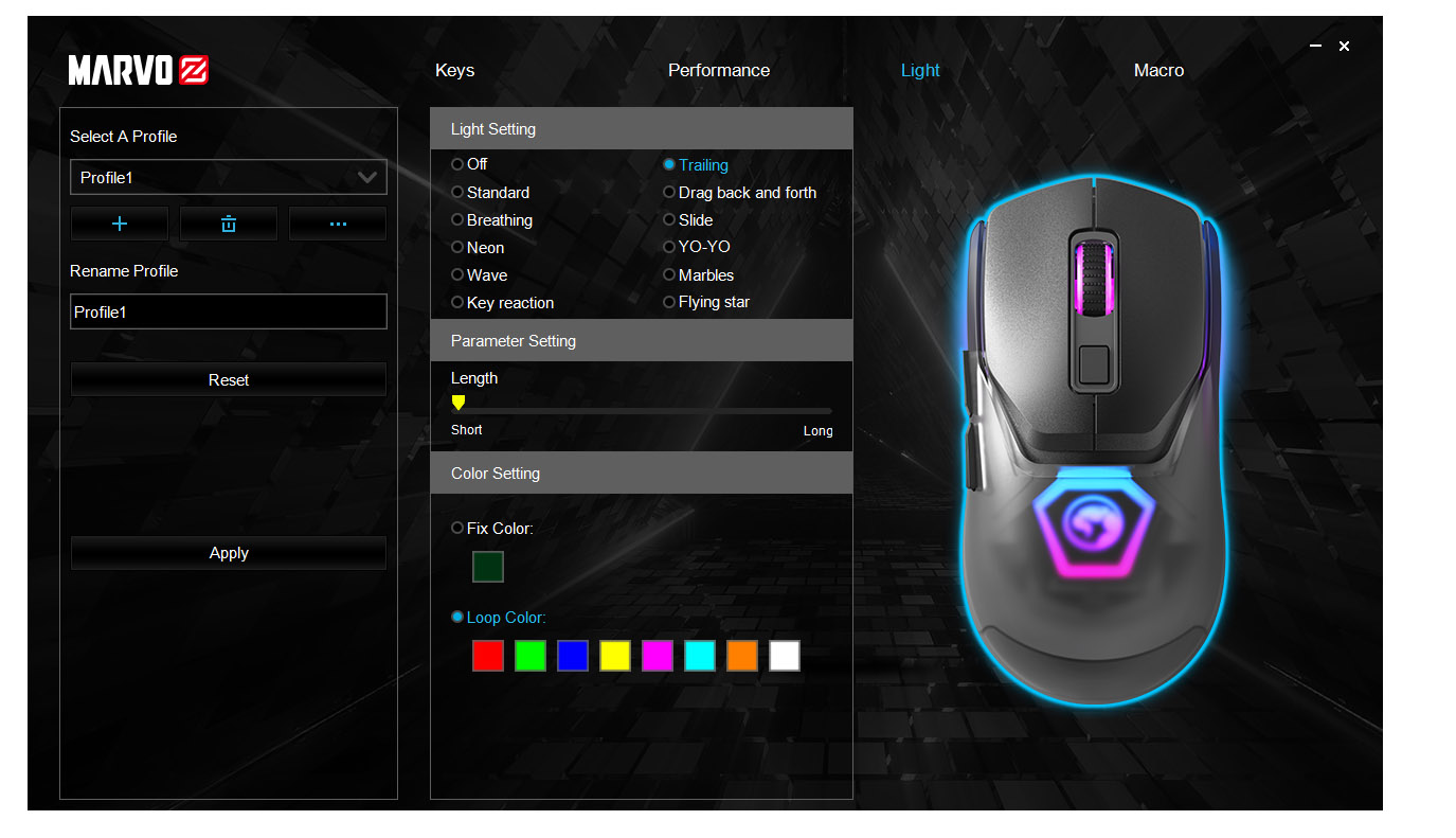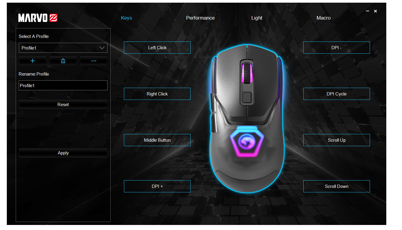 - Optický senzor PIXART 3327 – citlivost až 12 000 DPI a obnovovací frekvence 1 000 Hz (polling rate).