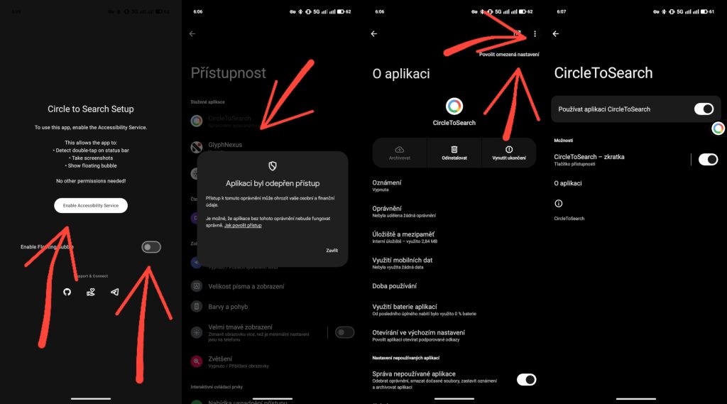 Aplikaci jsem testoval na Androidu 16 a funguje dobře. Je však potřeba ji správně nastavit – po straně displeje se musí zobrazit malá bublina aplikace, která slouží ke spuštění. Poté je nutné povolit všechna potřebná oprávnění a ideálně vypnout optimalizace baterie, aby mohla fungovat spolehlivě.