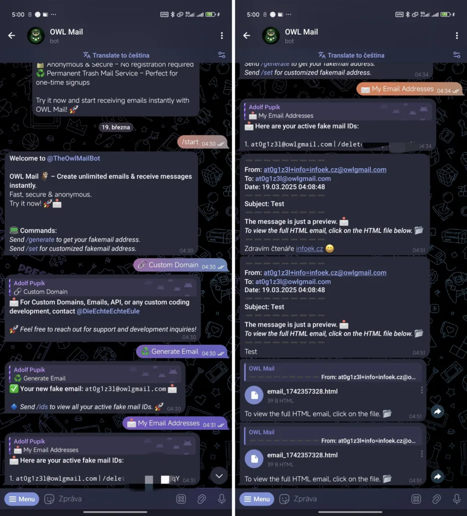 Telegram dlouhou dobu nabízí možnost využívat různé boty a mini aplikace. Na platformě se objevil bot služby OWL Mail. Jedním kliknutím vám vygeneruje anonymní e-mailovou schránku, číst si text v příchozích mailech a vše funguje zcela bez registrace a zdarma. Nemusíte službám na internetu prozrazovat vaši soukromou schránku.