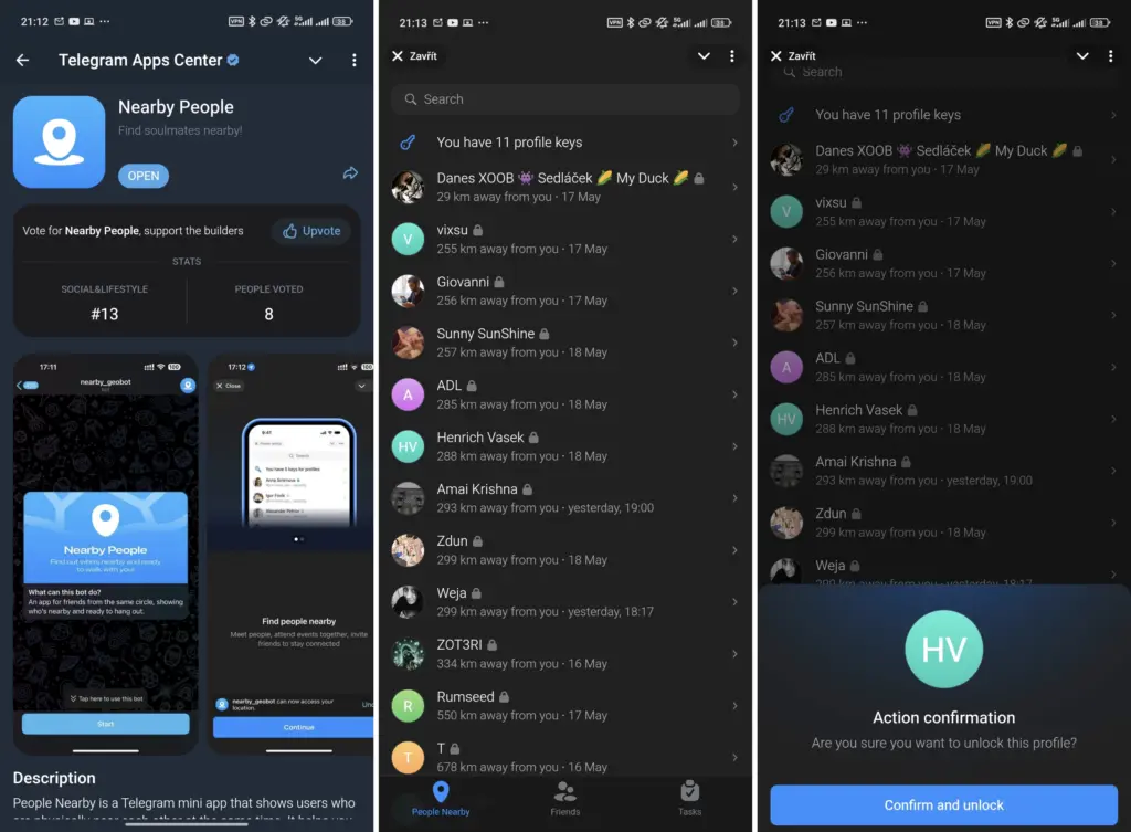 Aplikací je k dispozici již více, ale nejlépe funguje asi Nearby People. Je nová a věřím, že ji vývojář bude ještě ladit. Na základě polohy mobilu ukáže lidi v okolí a jejich přibližnou vzdálenost. Navázat s nimi můžete komunikaci, ale musíte k tomu mít „keys“ (klíče), což je měna v rámci aplikace. Klíče můžete získat denním vyzvednutím zdarma, případně si je dokoupit za měnu Telegram Stars. Pozvat do aplikace můžete vaše přátelé a vidět jejich přibližnou polohu. To vše samozřejmě s jejich souhlasem.