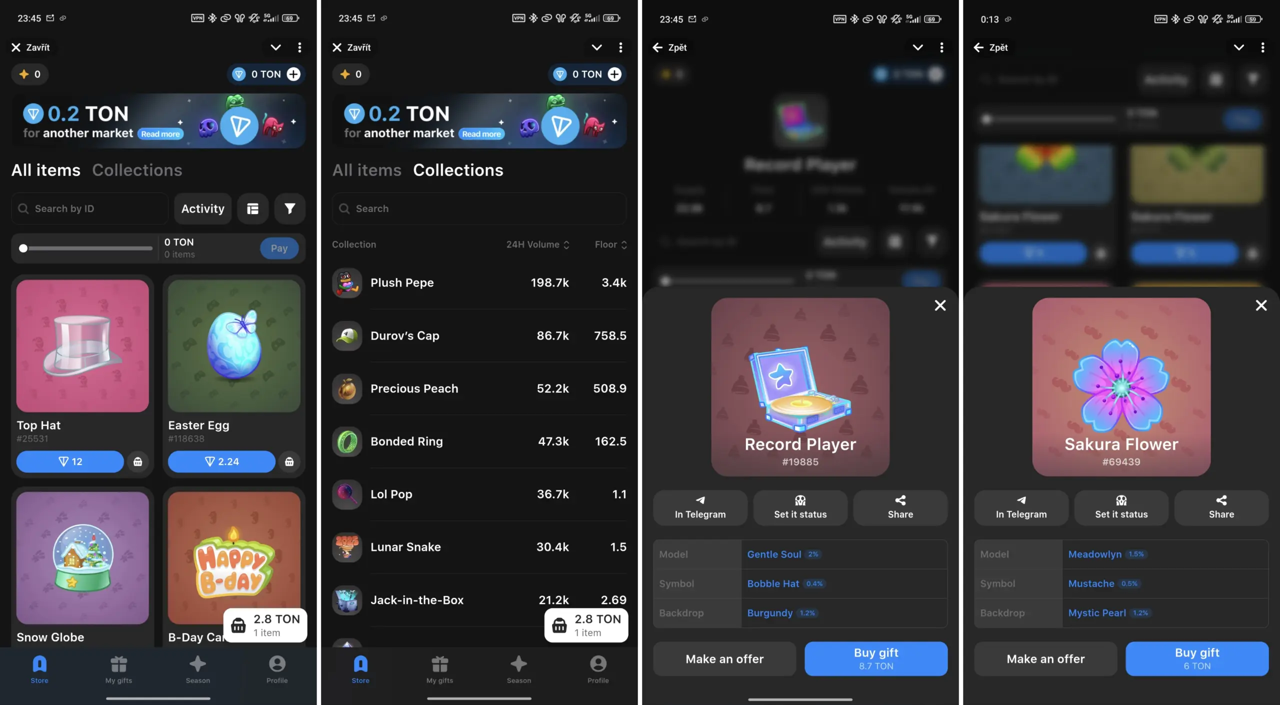 Orientace v uživatelském prostředí je jednoduchá, na horní části můžete přidat své prostředky v Toncoinu a začít nakupovat hodnotná NFT. Po zakoupení bude dárek k dispozici v rámci služby Portals Market, takže vlastně stále nebudete jeho majitelem. Snadno ho však můžete převést na svůj Telegram. Stačí v položce „My Gifts“ dárek otevřít a vybrat tlačítko „Withdraw a gift“. Za zanedbatelný poplatek 0.1 TON bude během chvilky převeden právě na váš Telegram. Kdokoliv ho bude vidět na profilu, můžete si ho nastavit jako stav vedle svého jména nebo se s ním chlubit odkazem.