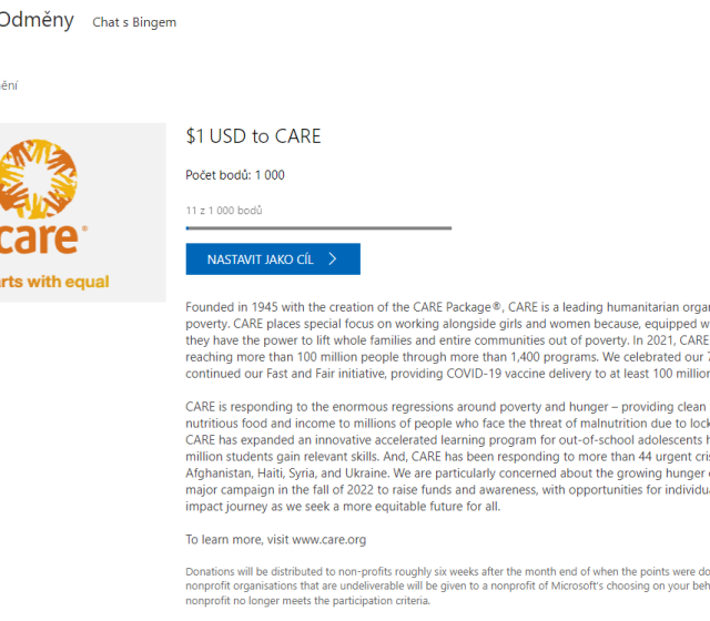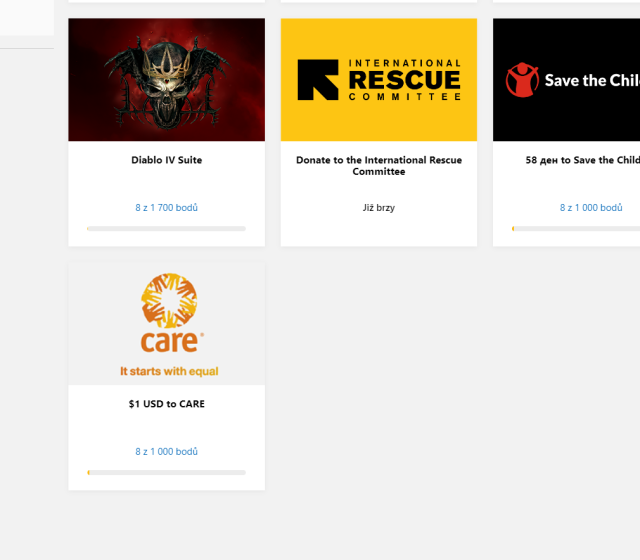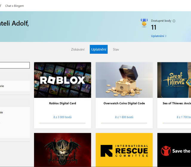 Uplatnění bodů Microsoft Rewards je na našem trhu výrazně horší, než to je v USA či jiných trzích. Body můžete uplatnit do her: Roblox, Overwatch, Sea of Thieves: Ancient Coin Pack, Diablo IV Suite a časem budou nejspíš další. Pokud ani jednu z her v seznamu nehrajete, můžete body uplatnit k tomu, aby Microsoft poskytl peníze charitám. V seznamu jsou organizace Care.org a Save the Children. Samozřejmě se nejedná o nějaký obrovský dar, ale když už máte 1000 bodů, můžete je směnit na $1 charitě.