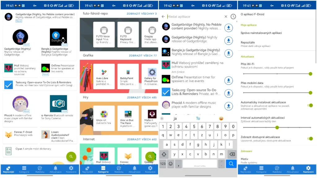 - FUTO Keyboard a další aplikace – je nutné si přidat repozitář v tomto odkaze do F-Droidu. Obsahuje výbornou klávesnici, Grayjay pro YouTube bez reklam, Spotify a další služby v jednom. Dále stojí za vyzkoušení bezpečná aplikace.